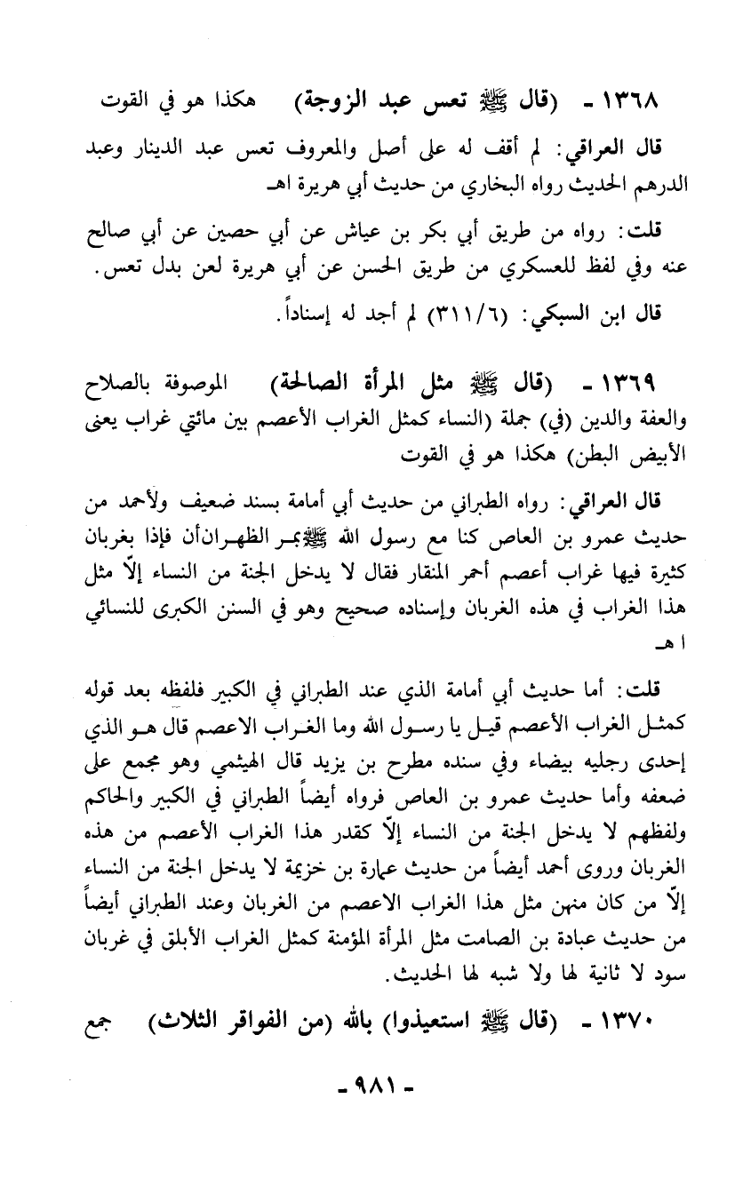 قال العراقي: رواه الطبراني من حديث أبي أمامة بسند ضعيف ولأحمد من حديث عمرو بن العاص كنا مع رسول الله - صلّى الله عليه وسلم - بمر الظهران أن فإذا بغربان كثيرة فيها غراب أعصم أحمر المنقار فقال لا يدخل الجنة من النساء إلاَّ مثل هذا الغراب في هذه الغربان وإسناده صحيح وهو في السنن الكبرى للنسائي اهـ