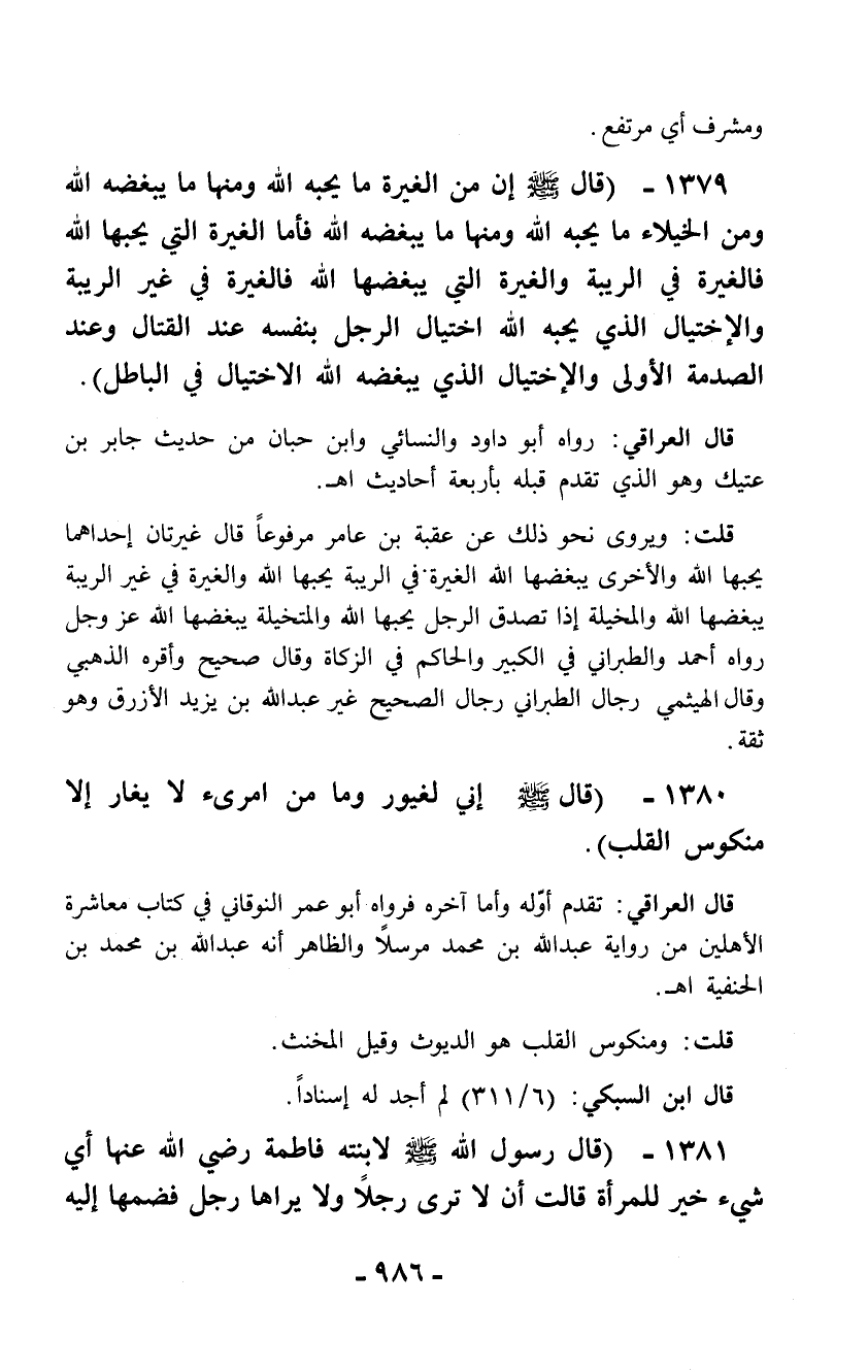 1380 - (قال - صلّى الله عليه وسلم - إني لغيور وما من امرئ لا يغار إلا منكوس القلب).