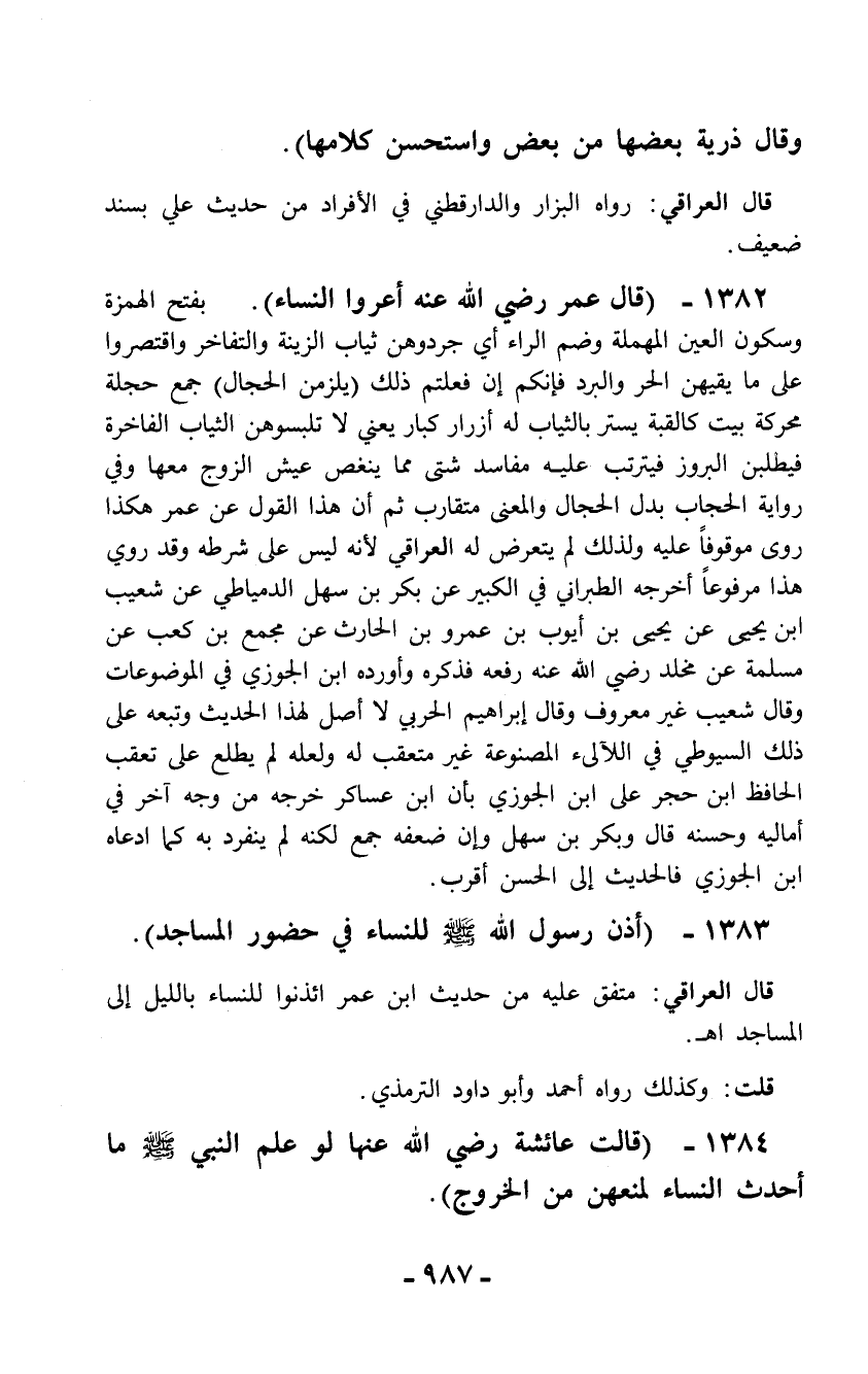 1382 - (قال عمر رضي الله عنه أعروا النساء). بفتح الهمزة وسكون العين المهملة وضم الراء أي جردوهن ثياب الزينة والتفاخر واقتصروا على ما يقيهن الحر والبرد فإنكم إن فعلتم ذلك (يلزمن الحجال) جمع حجلة محركة بيت كالقبة يستر بالثياب له أزرار كبار يعني لا تلبسوهن الثياب الفاخرة فيطلبن البروز فيترتب عليه مفاسد شتى مما ينغص عيش الزوج معها وفي رواية الحجاب بدل الحجال والمعنى متقارب ثم أن هذا القول عن عمر هكذا روى موقوفاً عليه ولذلك لم يتعرض له العراقي لأنه ليس على شرطه وقد روي هذا مرفوعاً أخرجه الطبراني في الكبير عن بكر بن سهل الدمياطي عن شعيب ابن يحيى عن يحيى بن أيوب بن عمرو بن الحارث عن مجمع بن كعب عن مسلمة عن مخلد رضي الله عنه رفعه فذكره وأورده ابن الجوزي في الموضوعات وقال شعيب غير معروف وقال إبراهيم الحربي لا أصل لهذا الحديث وتبعه على ذلك السيوطي في اللآلئ المصنوعة غير متعقب له ولعله لم يطلع على تعقب الحافظ ابن حجر على ابن الجوزي بأن ابن عساكر خرجه من وجه آخر في أماليه وحسنه قال وبكر بن سهل وإن ضعفه جمع لكنه لم ينفرد به كما ادعاه ابن الجوزي فالحديث إلى الحسن أقرب.