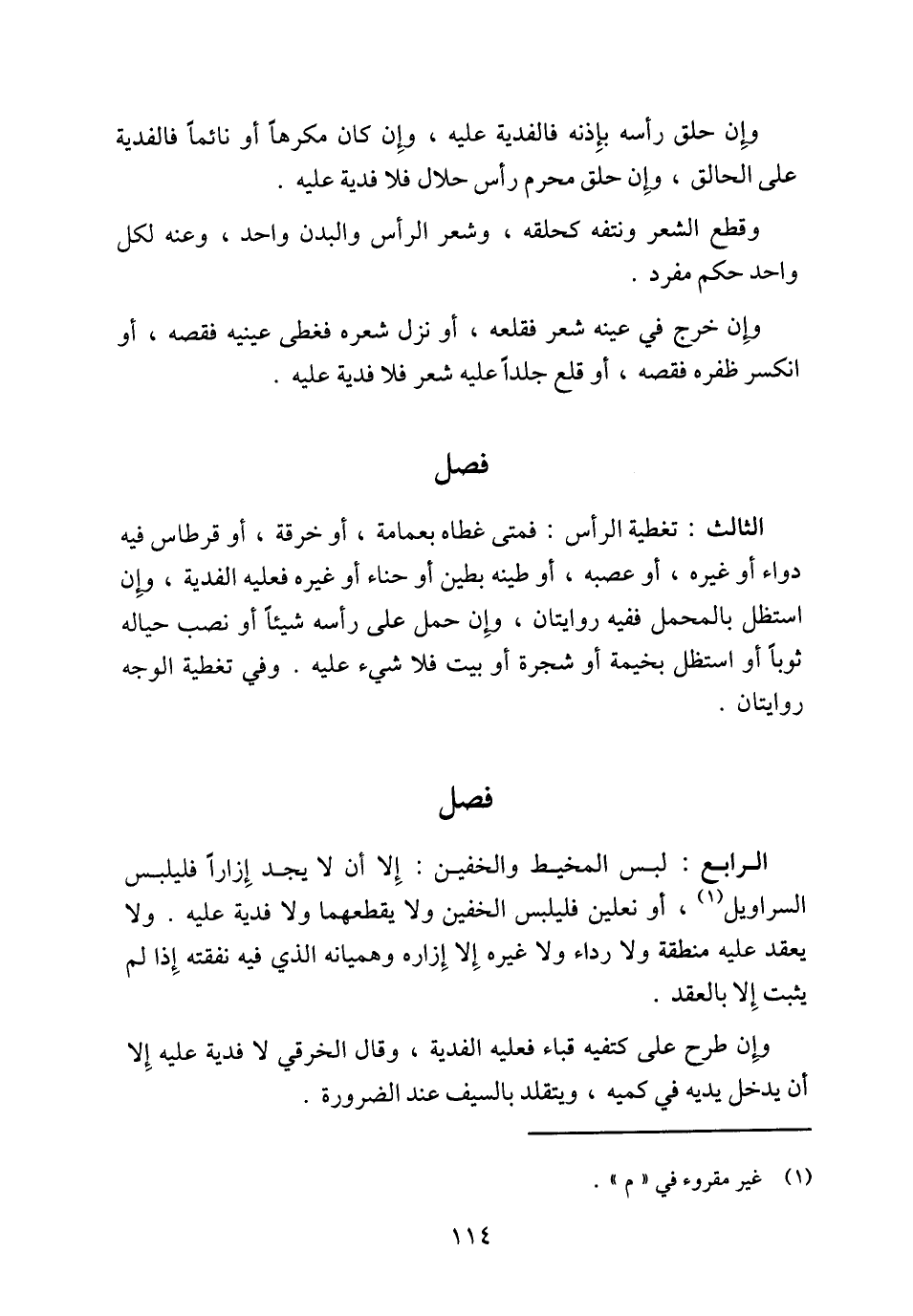 الثالث: تغطية الرأس: فمتى غطاه بعمامة، أو خرقة، أو قرطاس فيه دواء أو غيره، أو عصبه، أو طينه بطين أو حناء أو غيره فعليه الفدية، وإِن استظل بالمحمل ففيه روايتان، وإِن حمل على رأسه شيئاً أو نصب حياله ثوباً أو استظل بخيمة أو شجرة أو بيت فلا شيء عليه. وفي تغطية الوجه روايتان.