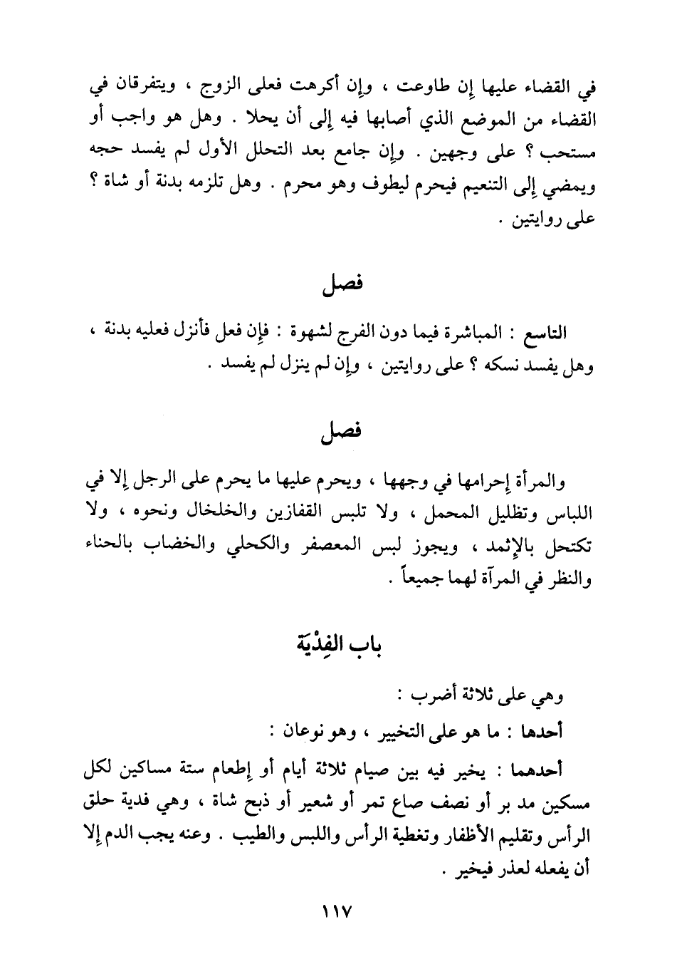 أحدهما: يخير فيه بين صيام ثلاثة أيام أو إِطعام ستة مساكين لكل مسكين مد بر أو نصف صاع تمر أو شعير أو ذبح شاة، وهي فدية حلق الرأس وتقليم الأظفار وتغطية الرأس واللبس والطيب. وعنه يجب الدم إِلا أن يفعله لعذر فيخير.