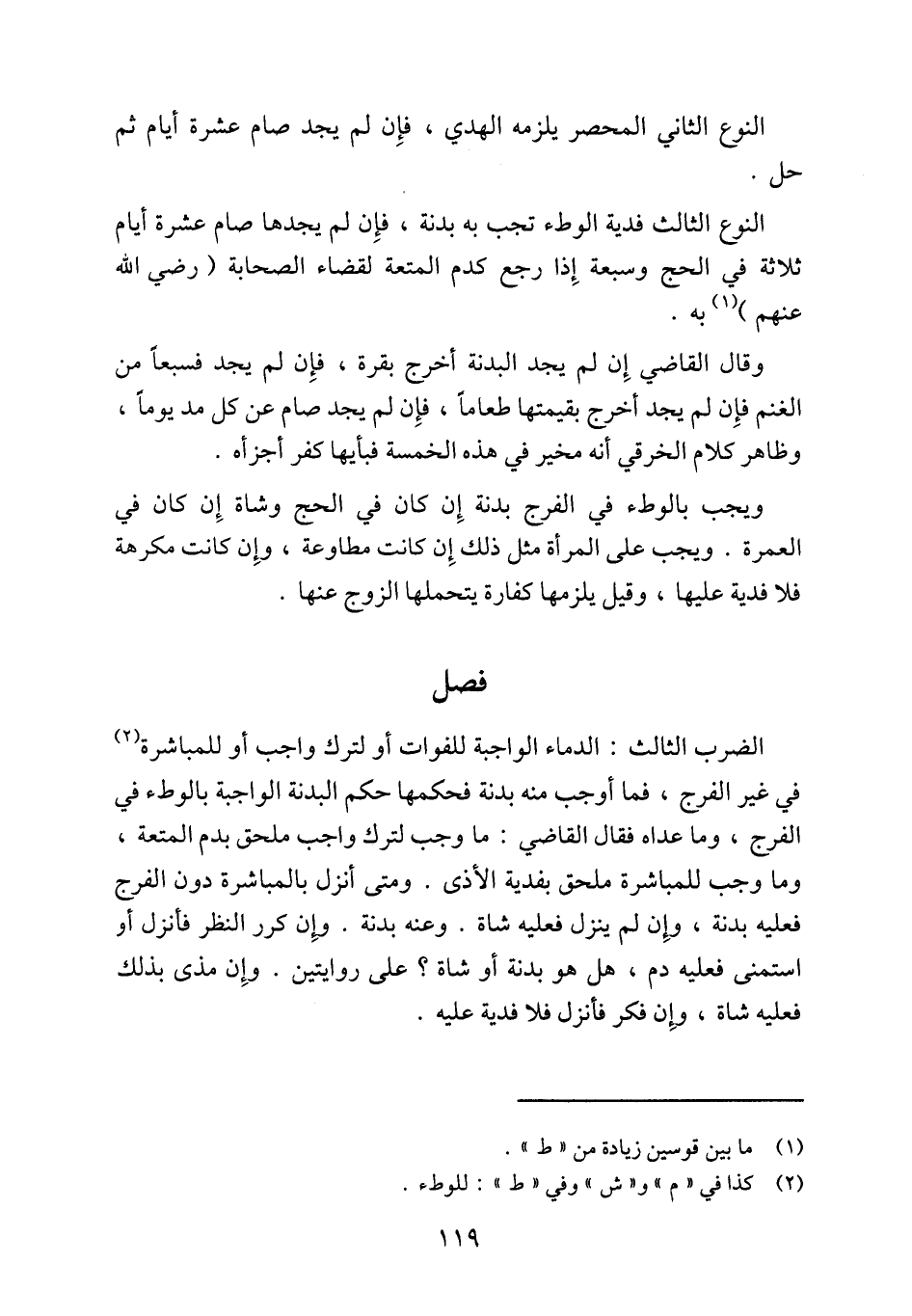 الضرب الثالث: الدماء الواجبة للفوات أو لترك واجب أو للمباشرة (¬2) في غير الفرج، فما أوجب منه بدنة فحكمها حكم البدنة الواجبة بالوطء في الفرج، وما عداه فقال القاضي: ما وجب لترك واجب ملحق بدم المتعة، وما وجب للمباشرة ملحق بفدية الأذى. ومتى أنزل بالمباشرة دون الفرج فعليه بدنة، وإِن لم ينزل فعليه شاة. وعنه بدنة. وِإن كرر النظر فأنزل أو استمنى فعليه دم، هل هو بدنة أو شاة؟ على روايتين. وإِن مذى بذلك فعليه شاة، وإِن فكر فأنزل فلا فدية عليه.