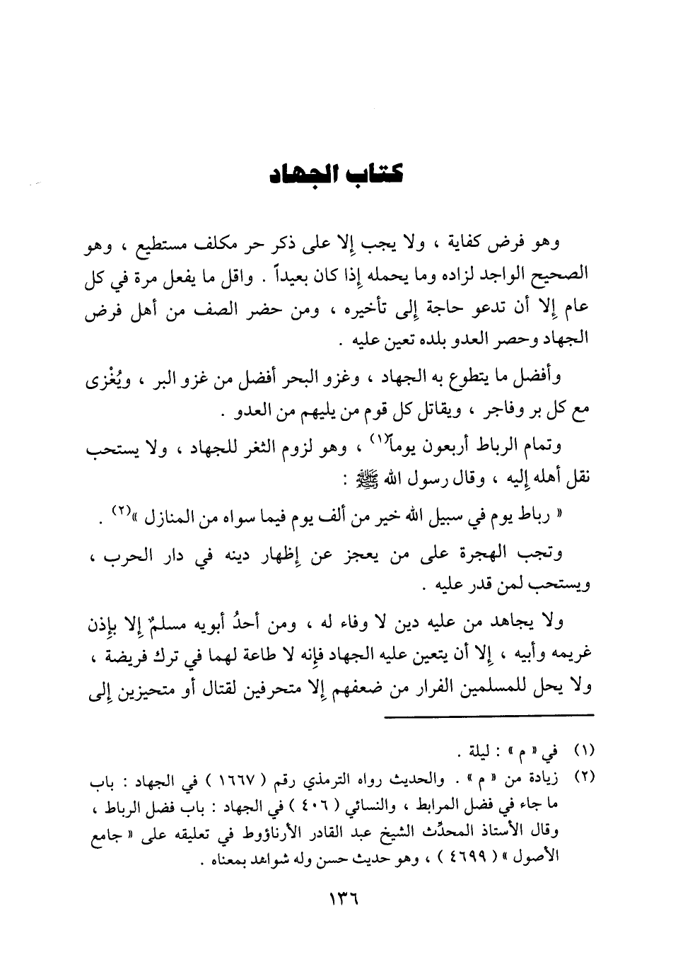 وهو فرض كفاية، ولا يجب إِلا على ذكر حر مكلف مستطيع، وهو الصحيح الواجد لزاده وما يحمله إِذا كان بعيداً. واقل ما يفعل مرة في كل عام إِلا أن تدعو حاجة إِلى تأخيره، ومن حضر الصف من أهل فرض الجهاد وحصر العدو بلده تعين عليه.