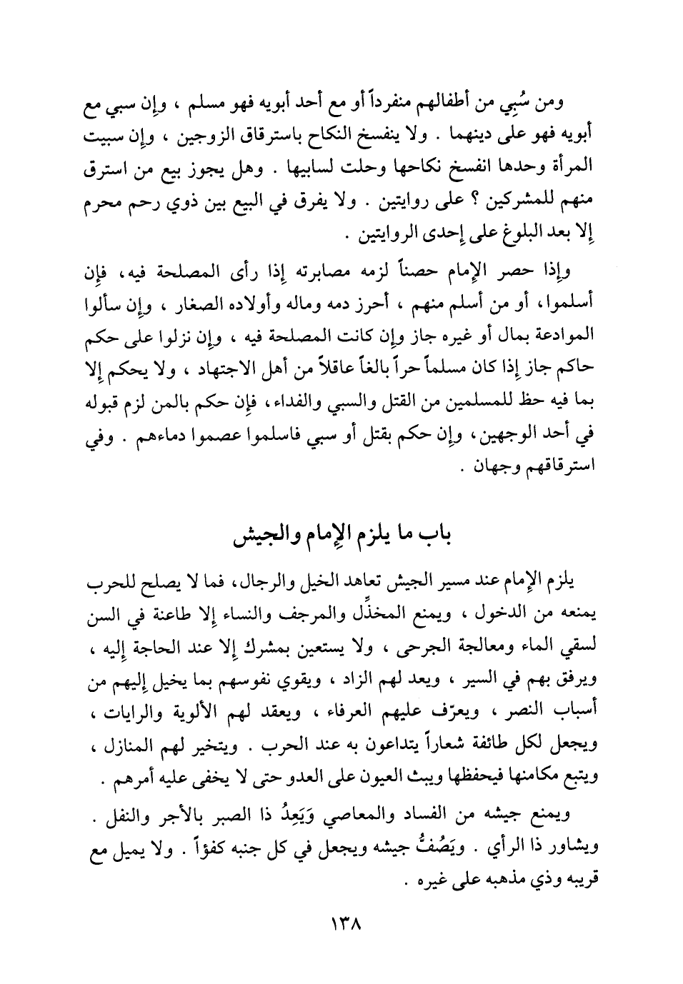 ومن سُبِي من أطفالهم منفرداً أو مع أحد أبويه فهو مسلم، وإِن سبي مع أبويه فهو على دينهما. ولا ينفسخ النكاح باسترقاق الزوجين، وإِن سبيت المرأة وحدها انفسخ نكاحها وحلت لسابيها. وهل يجوز بيع من استرق منهم للمشركين؟ على روايتين. ولا يفرق في البيع بين ذوي رحم محرم إِلا بعد البلوغ على إِحدى الروايتين.