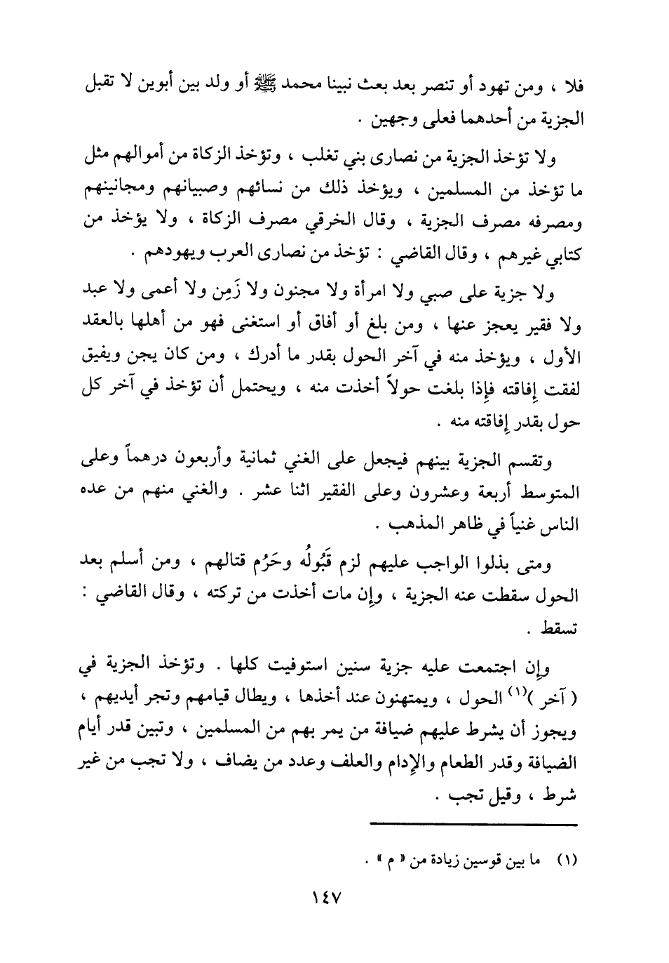 ولا تؤخذ الجزية من نصارى بني تغلب، وتؤخذ الزكاة من أموالهم مثل ما تؤخذ من المسلمين، ويؤخذ ذلك من نسائهم وصبيانهم ومجانينهم ومصرفه مصرف الجزية، وقال الخرقي مصرف الزكاة، ولا يؤخذ من كتابي غيرهم، وقال القاضي: تؤخذ من نصارى العرب ويهودهم.