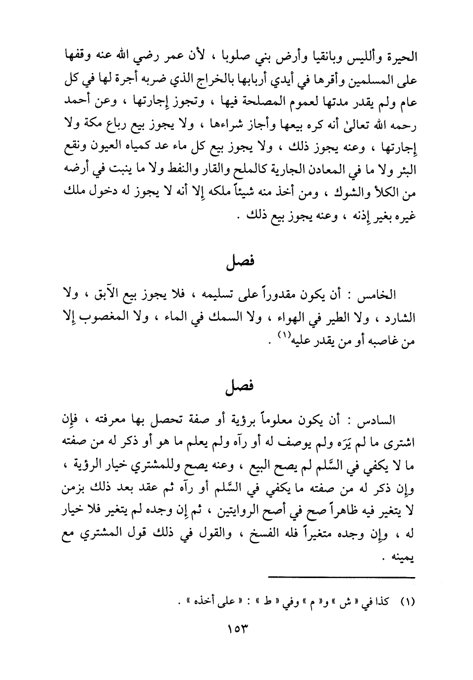 الحيرة وألليس وبانقيا وأرض بني صلوبا، لأن عمر رضي الله عنه وقفها على المسلمين وأقرها في أيدي أربابها بالخراج الذي ضربه أجرة لها في كل عام ولم يقدر مدتها لعموم المصلحة فيها، وتجوز إِجارتها، وعن أحمد رحمه الله تعالى أنه كره بيعها وأجاز شراءها، ولا يجوز بيع رباع مكة ولا إِجارتها، وعنه يجوز ذلك، ولا يجوز بيع كل ماء عد كمياه العيون ونقع البئر ولا ما في المعادن الجارية كالملح والقار والنفط ولا ما ينبت في أرضه من الكلأ والشوك، ومن أخذ منه شيئاً ملكه إِلا أنه لا يجوز له دخول ملك غيره بغير إِذنه، وعنه يجوز بيع ذلك.