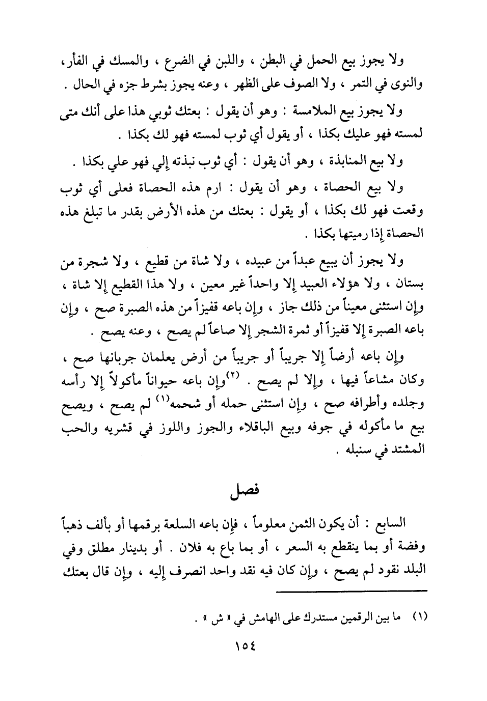 السابع: أن يكون الثمن معلوماً، فإِن باعه السلعة برقمها أو بألف ذهباً وفضة أو بما ينقطع به السعر، أو بما باع به فلان. أو بدينار مطلق وفي البلد نقود لم يصح، وإِن كان فيه نقد واحد انصرف إِليه، وإِن قال بعتك