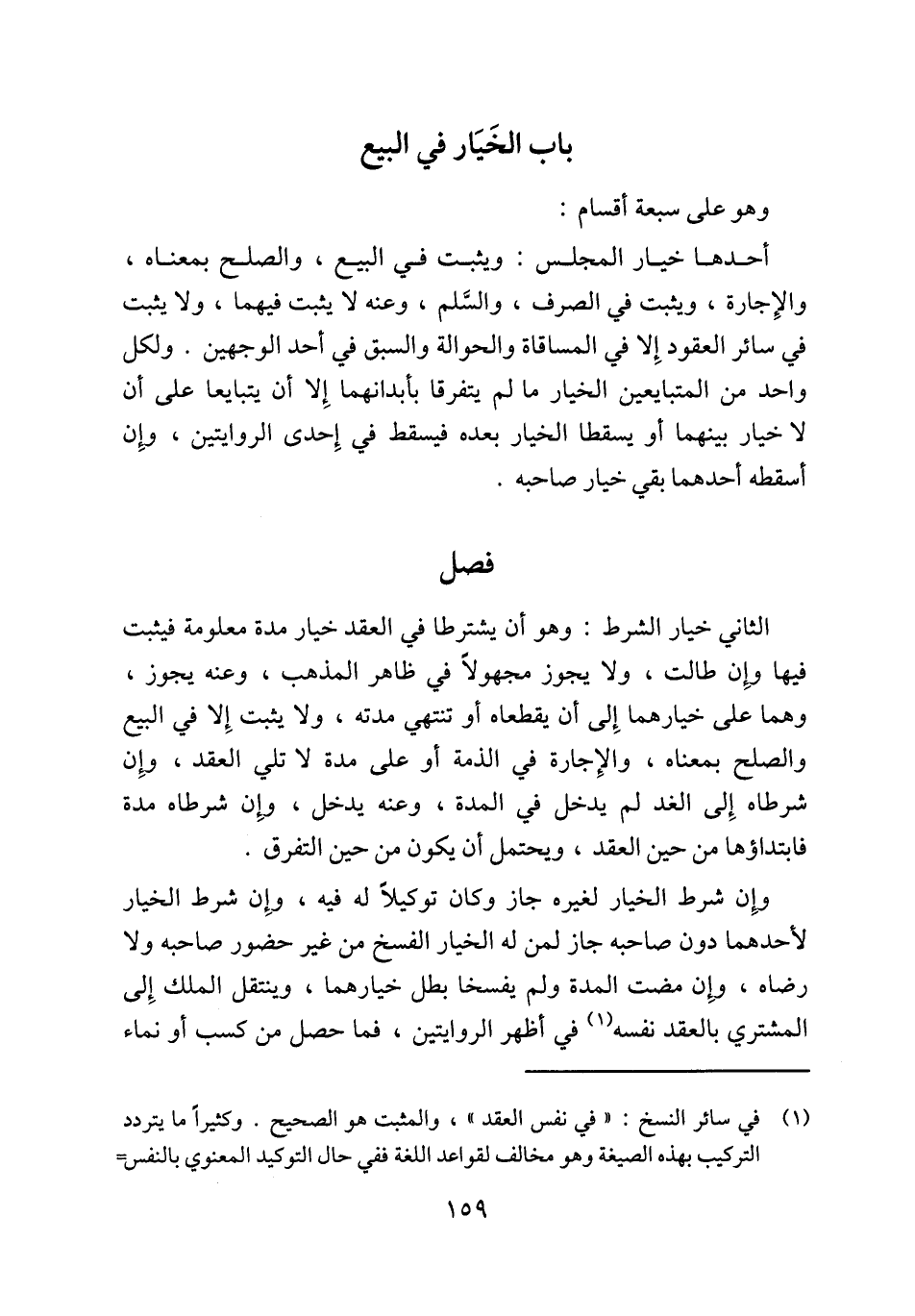 أحدها خيار المجلس: ويثبت في البيع، والصلح بمعناه، والإِجارة، ويثبت في الصرف، والسَّلم، وعنه لا يثبت فيهما، ولا يثبت في سائر العقود إِلا في المساقاة والحوالة والسبق في أحد الوجهين. ولكل واحد من المتبايعين الخيار ما لم يتفرقا بأبدانهما إِلا أن يتبايعا على أن لا خيار بينهما أو يسقطا الخيار بعده فيسقط في إِحدى الروايتين، وإِن أسقطه أحدهما بقي خيار صاحبه.