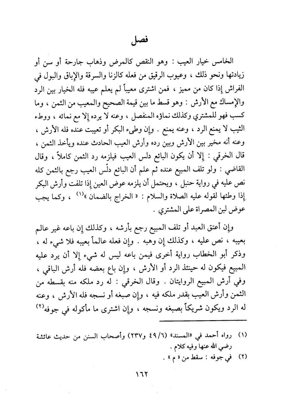 الخامس خيار العيب: وهو النقص كالمرض وذهاب جارحة أو سن أو زيادتها ونحو ذلك، وعيوب الرقيق من فعله كالزنا والسرقة والإِباق والبول في الفراش إِذا كان من مميز، فمن اشترى معيباً لم يعلم عيبه فله الخيار بين الرد والإِمساك مع الأرش: وهو قسط ما بين قيمة الصحيح والمعيب من الثمن، وما كسب فهو للمشتري وكذلك نماؤه المنفصل، وعنه لا يرده إِلا مع نمائه، ووطء الثيب لا يمنع الرد، وعنه يمنع. وإِن وطئ البكر أو تعيبت عنده فله الأرش، وعنه أنه مخير بين الأرش وبين رده وأرش العيب الحادث عنده ويأخذ الثمن، قال الخرقي: إِلا أن يكون البائع دلس العيب فيلزمه رد الثمن كاملاً، وقال القاضي: ولو تلف المبيع عنده ثم علم أن البائع دلّس العيب رجع بالثمن كله نص عليه في رواية حنبل، ويحتمل أن يلزمه عوض العين إِذا تلفت وأرش البكر إِذا وطئها لقوله عليه الصلاة والسلام: "الخراج بالضمان" (¬1)، وكما يجب عوض لبن المصراة على المشتري.