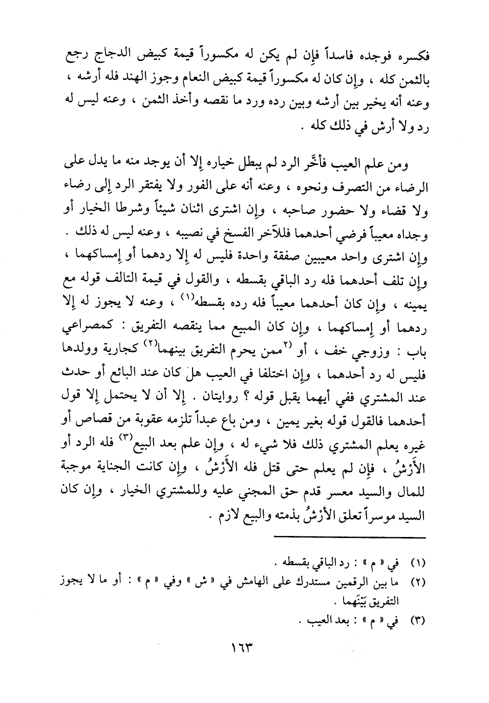 ومن علم العيب فأخَّر الرد لم يبطل خياره إِلا أن يوجد منه ما يدل على الرضاء من التصرف ونحوه، وعنه أنه على الفور ولا يفتقر الرد إِلى رضاء ولا قضاء ولا حضور صاحبه، وإِن اشترى اثنان شيئاً وشرطا الخيار أو وجداه معيباً فرضي أحدهما فللآخر الفسغ في نصيبه، وعنه ليس له ذلك. وإِن اشترى واحد معيبين صفقة واحدة فليس له إِلا ردهما أو إِمساكهما، وإِن تلف أحدهما فله رد الباقي بقسطه، والقول في قيمة التالف قوله مع يمينه، وإِن كان أحدهما معيباً فله رده بقسطه (¬1)، وعنه لا يجوز له إِلا ردهما أو إِمساكهما، وإِن كان المبيع مما ينقصه التفريق: كمصراعي باب: وزوجي خف، أو [ممن يحرم التفريق بينهما (¬2)] كجارية وولدها فليس له رد أحدهما، وإِن اختلفا في العيب هل كان عند البائع أو حدث عند المشتري ففي أيهما يقبل قوله؟ روايتان. إِلا أن لا يحتمل إِلا قول أحدهما فالقول قوله بغير يمين، ومن باع عبداً تلزمه عقوبة من قصاص أو غيره يعلم المشتري ذلك فلا شيء له، وإِن علم بعد البيع (¬3) فله الرد أو الأَرْشُ، فإِن لم يعلم حتى قتل فله الأَرْشُ، وإِن كانت الجناية موجبة للمال والسيد معسر قدم حق المجني عليه وللمشتري الخيار، وإِن كان السيد موسراً تعلق الأرْشُ بذمته والبيع لازم.
