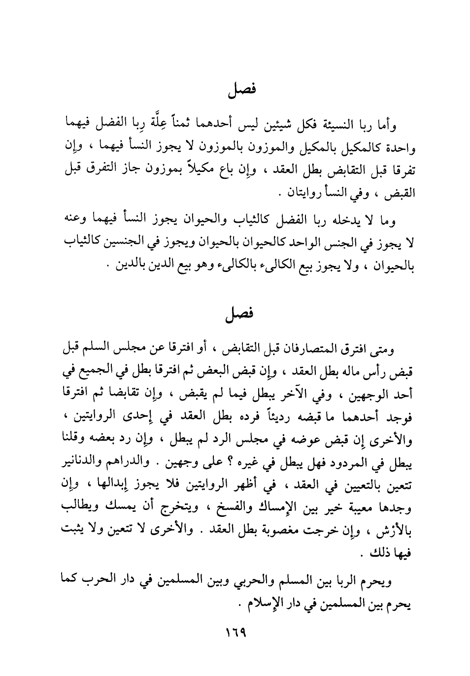 ومتى افترق المتصارفان قبل التقابض، أو افترقا عن مجلس السلم قبل قبض رأس ماله بطل العقد، وإِن قبض البعض ثم افترقا بطل في الجميع في أحد الوجهين، وفي الآخر يبطل فيما لم يقبض، وإِن تقابضا ثم افترقا فوجد أحدهما ما قبضه رديئاً فرده بطل العقد في إِحدى الروايتين، والأخرى إِن قبض عوضه في مجلس الرد لم يبطل، وإِن رد بعضه وقلنا يبطل في المردود فهل يبطل في غيره؟ على وجهين. والدراهم والدنانير تتعين بالتعيين في العقد، في أظهر الروايتين فلا يجوز إِبدالها، وإِن وجدها معيبة خير بين الإِمساك والفسخ، ويتخرج أن يمسك ويطالب بالأرْش، وإِن خرجت مغصوبة بطل العقد. والأخرى لا تتعين ولا يثبت فيها ذلك.