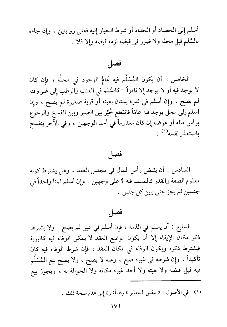 الخامس: أن يكون المُسَلَّم فيه عَامُّ الوجودِ في محلِّه، فإِن كان لا يوجد فيه أو لا يوجد إِلا نادراً: كالسَّلم في العنب والرطب إِلى غير وقته لم يصح، وإِن أسلم في ثمرة بستان بعينه أو قرية صغيرة لم يصح، وإِن اسلم إِلى محل يوجد فيه عامّاً فانقطع خُيِّر بين الصبر وبين الفسخ والرجوع برأس ماله أو عوضه إِن كان معدوماً في أحد الوجهين، وفي الآخر ينفسخ بالمتعذر نفسه (¬1).