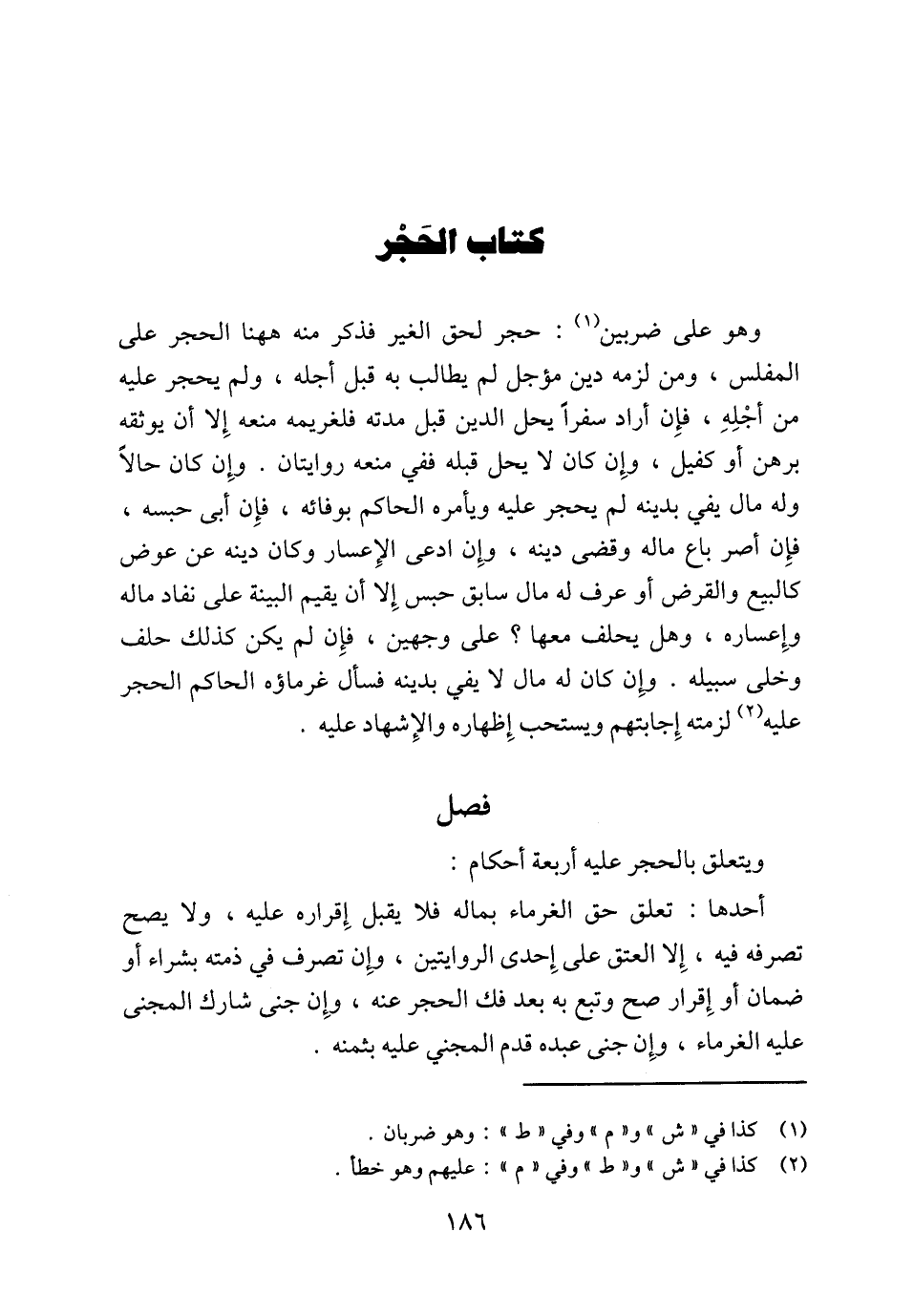 وهو على ضربين (¬1): حجر لحق الغير فذكر منه ههنا الحجر على المفلس، ومن لزمه دين مؤجل لم يطالب به قبل أجله، ولم يحجر عليه من أجْلِهِ، فإِن أراد سفراً يحل الدين قبل مدته فلغريمه منعه إِلا أن يوثقه برهن أو كفيل، وإِن كان لا يحل قبله ففي منعه روايتان. وإِن كان حالًا وله مال يفي بدينه لم يحجر عليه ويأمره الحاكم بوفائه، فإِن أبى حبسه، فإِن أصر باع ماله وقضى دينه، وإِن ادعى الإِعسار وكان دينه عن عوض كالبيع والقرض أو عرف له مال سابق حبس إِلا أن يقيم البينة على نفاد ماله وإِعساره، وهل يحلف معها؟ على وجهين، فإِن لم يكن كذلك حلف وخلى سبيله. وإِن كان له مال لا يفي بدينه فسأل غرماؤه الحاكم الحجر عليه (¬2) لزمته إِجابتهم ويستحب إِظهاره والإِشهاد عليه.