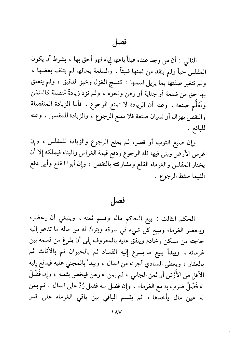 الحكم الثالث: بيع الحاكم ماله وقسم ثمنه، وينبغي أن يحضره ويحضر الغرماء ويبيع كل شيء في سوقه ويترك له من ماله ما تدعو إِليه حاجته من مسكن وخادم وينفق عليه بالمعروف إِلى أن يفرغ من قسمه بين غرمائه، ويبدأ ببيع ما يسرع إِليه الفساد ثم بالحيوان ثم بالأثاث ثم بالعقار، ويعطى المنادي أجرته من المال، ويبدأ بالمجني عليه فيدفع إِليه الأقل من الأَرْش أو ثمن الجاني، ثم بمن له رهن فيخص بثمنه، وإِن فَضَلَ له فَضْلُ ضرب به مع الغرماء، وإِن فضل منه فضل رُدَّ على المال. ثم بمن له عين مال يأخذها، ثم يقسم الباقي بين باقي الغرماء على قدر