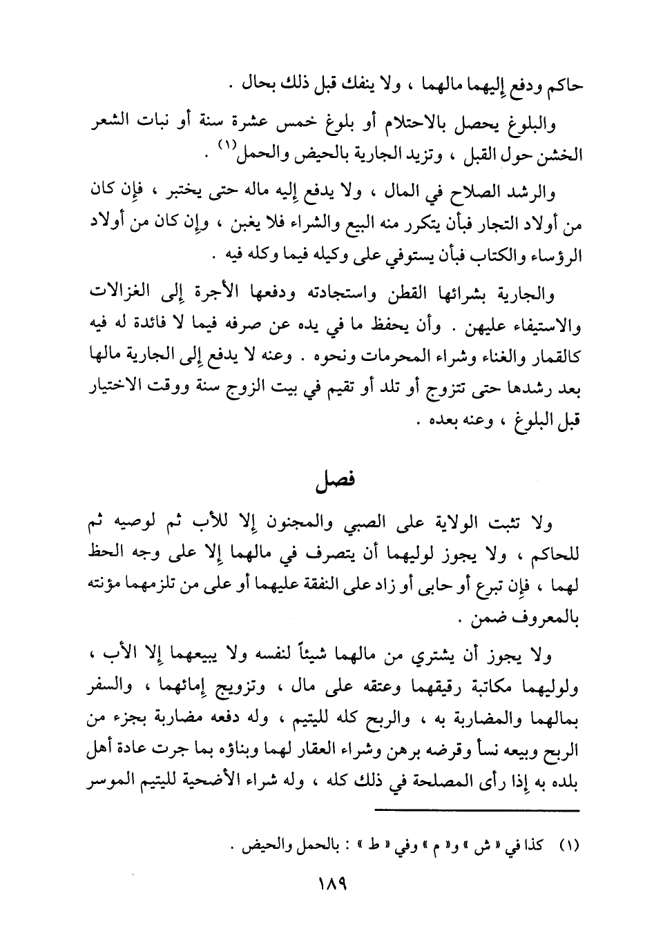 ولا تثبت الولاية على الصبي والمجنون إِلا للأب ثم لوصيه ثم للحاكم، ولا يجوز لوليهما أن يتصرف في مالهما إِلا على وجه الحظ لهما، فإِن تبرع أو حابى أو زاد على النفقة عليهما أو على من تلزمهما مؤنته بالمعروف ضمن.