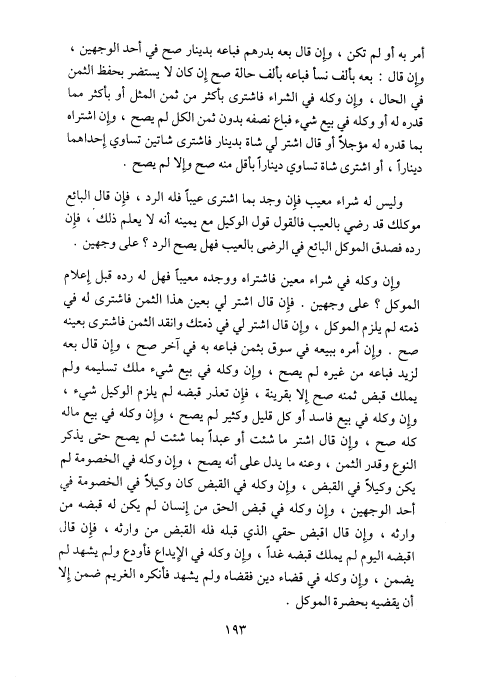 وإِن وكله في شراء معين فاشتراه ووجده معيباً فهل له رده قبل إِعلام الموكل؟ على وجهين. فإِن قال اشتر لي بعين هذا الثمن فاشترى له في ذمته لم يلزم الموكل، وإِن قال اشتر لي في ذمتك وانقد الثمن فاشترى بعينه صح. وإِن أمره ببيعه في سوق بثمن فباعه به في آخر صح، وإِن قال بعه لزيد فباعه من غيره لم يصح، وإِن وكله في بيع شيء ملك تسليمه ولم يملك قبض ثمنه صح إِلا بقرينة، فإِن تعذر قبضه لم يلزم الوكيل شيء، وإِن وكله في بيع فاسد أو كل قليل وكثير لم يصح، وإِن وكله في بيع ماله كله صح، وإِن قال اشتر ما شئت أو عبداً بما شئت لم يصح حتى يذكر النوع وقدر الثمن، وعنه ما يدل على أنه يصح، وإِن وكله في الخصومة لم يكن وكيلًا في القبض، وإِن وكله في القبض كان وكيلًا في الخصومة في أحد الوجهين، وإِن وكله في قبض الحق من إِنسان لم يكن له قبضه من وارثه، وإِن قال اقبض حقي الذي قبله فله القبض من وارثه، فإِن قال اقبضه اليوم لم يملك قبضه غداً، وإِن وكله في الإِيداع فأودع ولم يشهد لم يضمن، وإِن وكله في قضاء دين فقضاه ولم يشهد فأنكره الغريم ضمن إِلا أن يقضيه بحضرة الموكل.