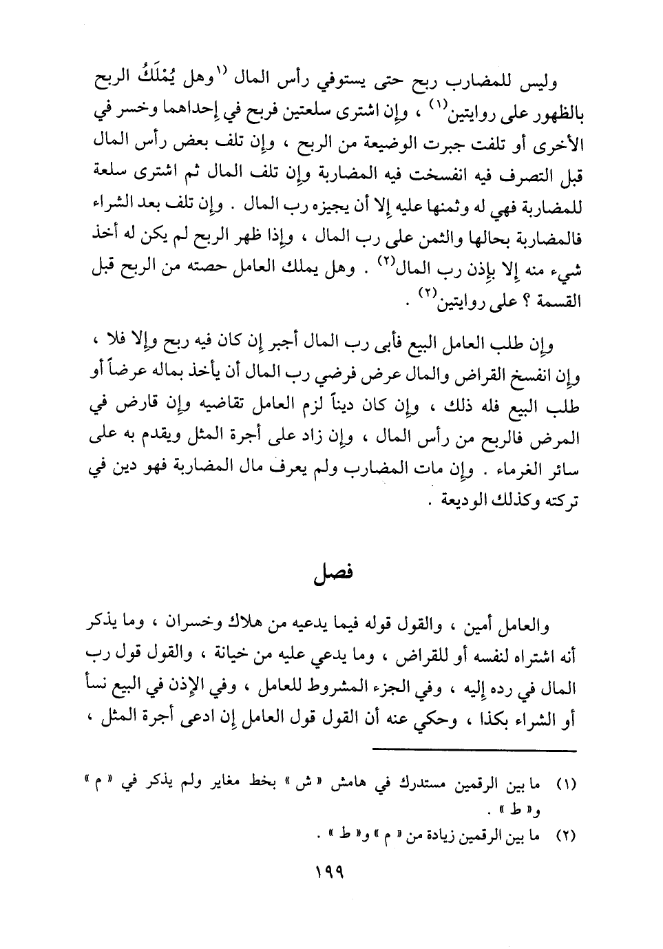 وليس للمضارب ربح حتى يستوفي رأس المال [وهل يُمْلَكُ الربح بالظهور على روايتين (¬1)]، وإِن اشترى سلعتين فربح في إِحداهما وخسر في الأخرى أو تلفت جبرت الوضيعة من الربح، وإِن تلف بعض رأس المال قبل التصرف فيه انفسخت فيه المضاربة وإِن تلف المال ثم اشترى سلعة للمضاربة فهي له وثمنها عليه إِلا أن يجيزه رب المال. وإِن تلف بعد الشراء فالمضاربة بحالها والثمن على رب المال، وإِذا ظهر الربح لم يكن له أخذ شيء منه إِلا بإِذن رب المال. [وهل يملك العامل حصته من الربح قبل القسمة؟ على روايتين (¬2)].