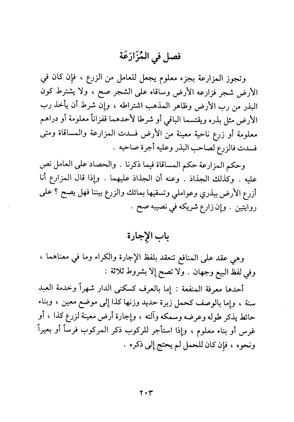 وتجوز المزارعة بجزء معلوم يجعل للعامل من الزرع، فإِن كان في الأرض شجر فزارعه الأرض وساقاه على الشجر صح، ولا يشترط كون البذر من رب الأرض وظاهر المذهب اشتراطه، وإِن شرط أن يأخذ رب الأرض مثل بذره ويقتسما الباقي أو شرطا لأحدهما قفزاناً معلومة أو دراهم معلومة أو زرع ناحية معينة من الأرض فسدت المزارعة والمساقاة ومتى فسدت فالزرع لصاحب البذر وعليه أجرة صاحبه.