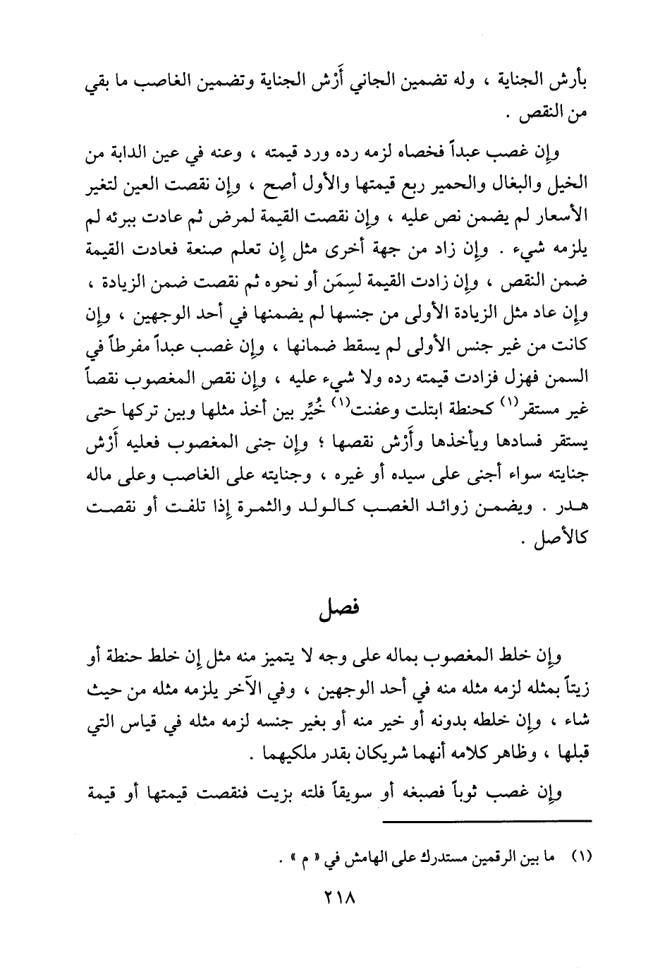 وإِن غصب عبداً فخصاه لزمه رده ورد قيمته، وعنه في عين الدابة من الخيل والبغال والحمير ربع قيمتها والأول أصح، وإِن نقصت العين لتغير الأسعار لم يضمن نص عليه، وإِن نقصت القيمة لمرض ثم عادت ببرئه لم يلزمه شيء. وإِن زاد من جهة أخرى مثل إِن تعلم صنعة فعادت القيمة ضمن النقص، وإِن زادت القيمة لسِمَن أو نحوه ثم نقصت ضمن الزيادة، وإِن عاد مثل الزيادة الأولى من جنسها لم يضمنها في أحد الوجهين، وإِن كانت من غير جنس الأولى لم يسقط ضمانها، وإِن غصب عبداً مفرطاً في السمن فهزل فزادت قيمته رده ولا شيء عليه، وإِن نقص المغصوب نقصاً غير مستقر [كحنطة ابتلت وعفنت (¬1)] خُيِّر بين أخذ مثلها وبين تركها حتى يستقر فسادها ويأخذها وأَرْش نقصها؛ وإِن جنى المغصوب فعليه أَرْش جنايته سواء أجنى على سيده أو غيره، وجنايته على الغاصب وعلى ماله هدر. ويضمن زوائد الغصب كالولد والثمرة إِذا تلفت أو نقصت كالأصل.