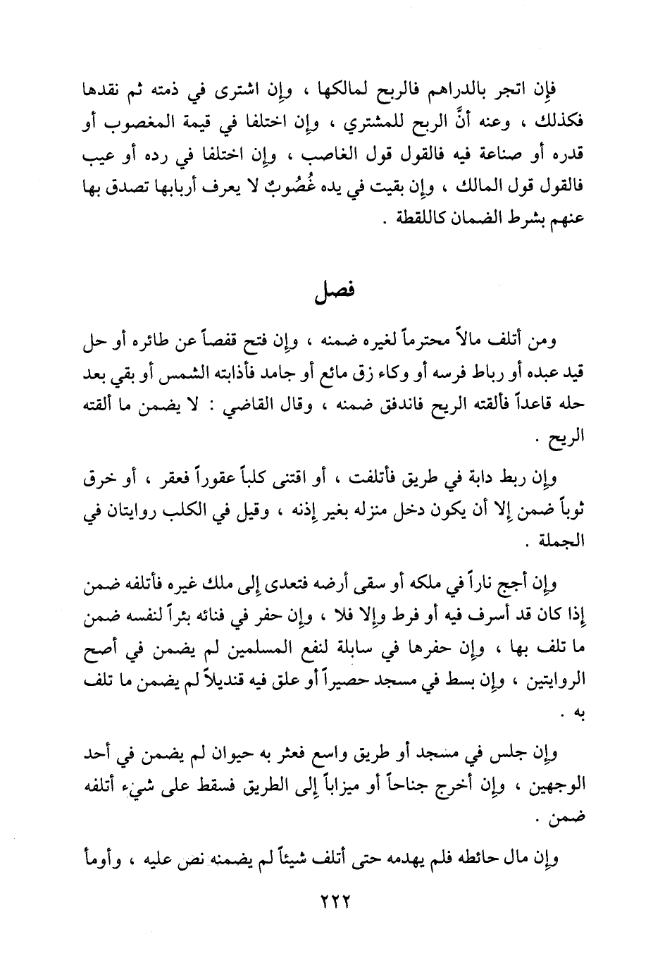 وإِن أجج ناراً في ملكه أو سقى أرضه فتعدى إِلى ملك غيره فأتلفه ضمن إِذا كان قد أسرف فيه أو فرط وإِلا فلا، وإِن حفر في فنائه بئراً لنفسه ضمن ما تلف بها، وإِن حفرها في سابلة لنفع المسلمين لم يضمن في أصح الروايتين، وإِن بسط في مسجد حصيراً أو علق فيه قنديلاً لم يضمن ما تلف به.