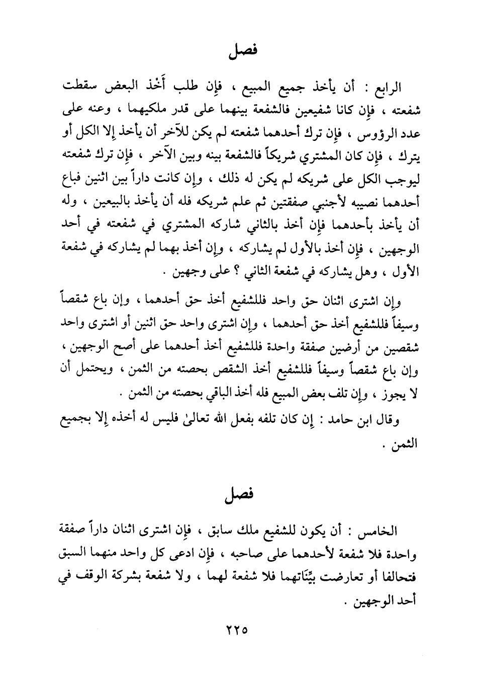 الرابع: أن يأخذ جميع المبيع، فإِن طلب أَخْذ البعض سقطت شفعته، فإِن كانا شفيعين فالشفعة بينهما على قدر ملكيهما، وعنه على عدد الرؤوس، فإِن ترك أحدهما شفعته لم يكن للآخر أن يأخذ إِلا الكل أو يترك، فإِن كان المشتري شريكاً فالشفعة بينه وبين الآخر، فإِن ترك شفعته ليوجب الكل على شريكه لم يكن له ذلك، وإِن كانت داراً بين اثنين فباع أحدهما نصيبه لأجنبي صفقتين ثم علم شريكه فله أن يأخذ بالبيعين، وله أن يأخذ بأحدهما فإِن أخذ بالثاني شاركه المشتري في شفعته في أحد الوجهين، فإِن أخذ بالأول لم يشاركه، وإِن أخذ بهما لم يشاركه في شفعة الأول، وهل يشاركه في شفعة الثاني؟ على وجهين.