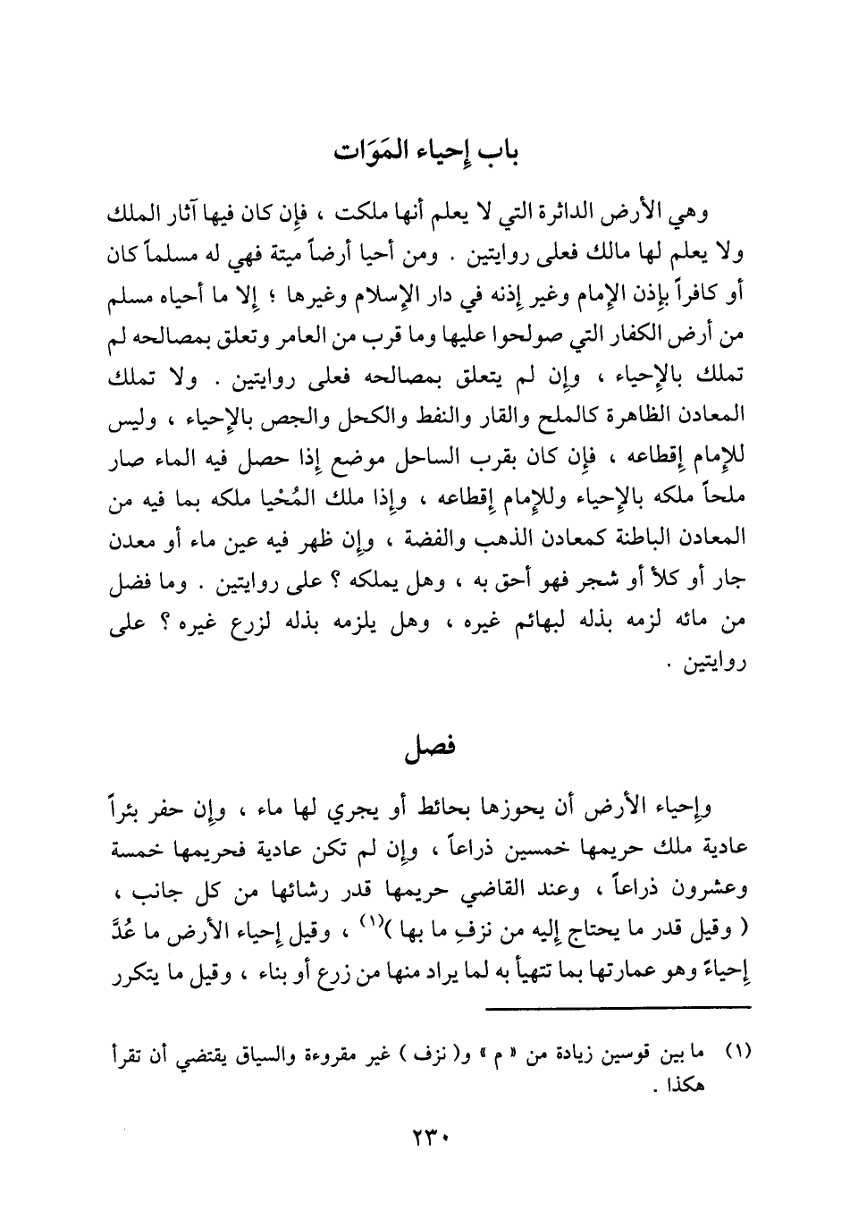 وهي الأرض الداثرة التي لا يعلم أنها ملكت، فإِن كان فيها آثار الملك ولا يعلم لها مالك فعلى روايتين. ومن أحيا أرضاً ميتة فهي له مسلماً كان أو كافراً بإِذن الإِمام وغير إِذنه في دار الإِسلام وغيرها؛ إِلا ما أحياه مسلم من أرض الكفار التي صولحوا عليها وما قرب من العامر وتعلق بمصالحه لم تملك بالإِحياء، وإِن لم يتعلق بمصالحه فعلى روايتين. ولا تملك المعادن الظاهرة كالملح والقار والنفط والكحل والجص بالإِحياء، وليس للإِمام إِقطاعه، فإِن كان بقرب الساحل موضع إِذا حصل فيه الماء صار ملحاً ملكه بالإِحياء وللإِمام إِقطاعه، وإِذا ملك المُحْيا ملكه بما فيه من المعادن الباطنة كمعادن الذهب والفضة، وإِن ظهر فيه عين ماء أو معدن جار أو كلأ أو شجر فهو أحق به، وهل يملكه؟ على روايتين. وما فضل من مائه لزمه بذله لبهائم غيره، وهل يلزمه بذله لزرع غيره؟ على روايتين.