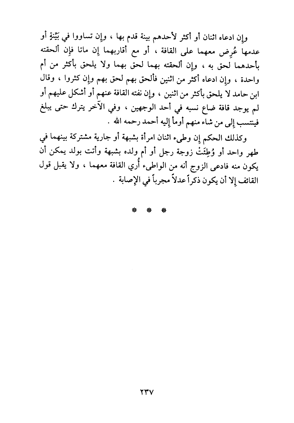 وكذلك الحكم إِن وطئ اثنان امرأة بشبهة أو جارية مشتركة بينهما في طهر واحد أو وُطِئَتْ زوجة رجل أو أم ولده بشبهة وأتت بولد يمكن أن يكون منه فادعى الزوج أنه من الواطئ أُري القافة معهما، ولا يقبل قول القائف إِلا أن يكون ذكراً عدلاً مجرباً في الإِصابة.