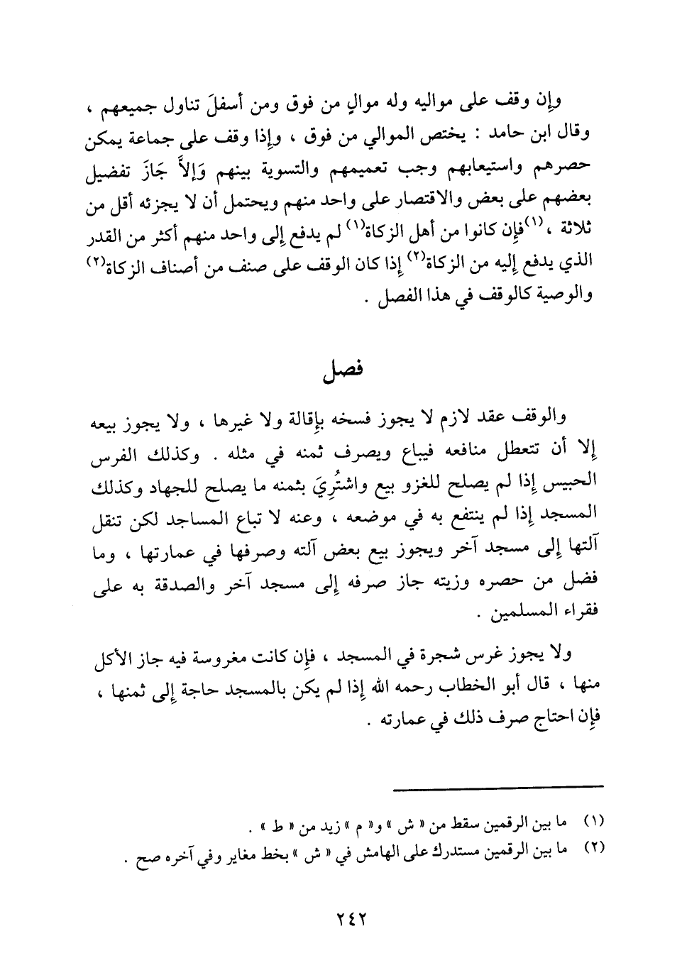 والوقف عقد لازم لا يجوز فسخه بإِقالة ولا غيرها، ولا يجوز بيعه إِلا أن تتعطل منافعه فيباع ويصرف ثمنه في مثله. وكذلك الفرس الحبيس إِذا لم يصلح للغزو بيع واشتُرِيَ بثمنه ما يصلح للجهاد وكذلك المسجد إِذا لم ينتفع به في موضعه، وعنه لا تباع المساجد لكن تنقل آلتها إِلى مسجد آخر ويجوز بيع بعض آلته وصرفها في عمارتها، وما فضل من حصره وزيته جاز صرفه إِلى مسجد آخر والصدقة به على فقراء المسلمين.
