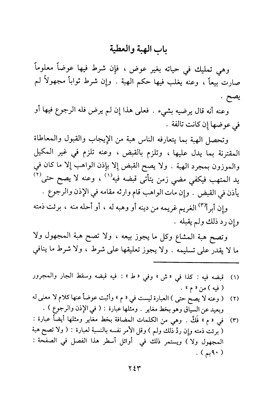 (¬3) في "م" فَكَّ. وهي من الكلمات المضافة بخط مغاير ومثلها أيضاً عبارة: (برئت ذمته وإِن ردَّ ذلك ولم) وقل الأمر نفسه بالنسبة لعبارة: (ولا تصح هبة المجهول ولا) ويستمر ذلك في أوائل أسطر هذا الفصل في الصفحة: (90 بم).