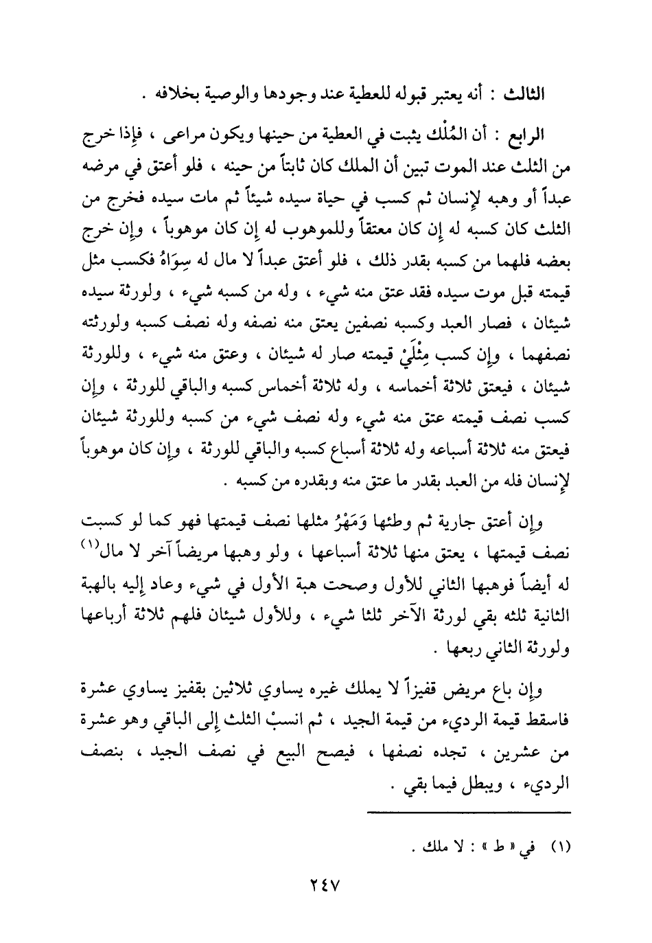 الرابع: أن المُلْك يثبت في العطية من حينها ويكون مراعى، فإِذا خرج من الثلث عند الموت تبين أن الملك كان ثابتاً من حينه، فلو أعتق في مرضه عبداً أو وهبه لإِنسان ثم كسب في حياة سيده شيئاً ثم مات سيده فخرج من الثلث كان كسبه له إِن كان معتقاً وللموهوب له إِن كان موهوباً، وإِن خرج بعضه فلهما من كسبه بقدر ذلك، فلو أعتق عبداً لا مال له سِوَاهُ فكسب مثل قيمته قبل موت سيده فقد عتق منه شيء، وله من كسبه شيء، ولورثة سيده شيئان، فصار العبد وكسبه نصفين يعتق منه نصفه وله نصف كسبه ولورثته نصفهما، وإِن كسب مِثْلَيْ قيمته صار له شيئان، وعتق منه شيء، وللورثة شيئان، فيعتق ثلاثة أخماسه، وله ثلاثة أخماس كسبه والباقي للورثة، وإِن كسب نصف قيمته عتق منه شيء وله نصف شيء من كسبه وللورثة شيئان فيعتق منه ثلاثة أسباعه وله ثلاثة أسباع كسبه والباقي للورثة، وإِن كان موهوباً لإِنسان فله من العبد بقدر ما عتق منه وبقدره من كسبه.