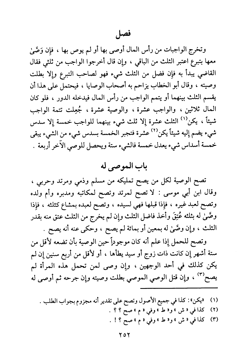 وتصح للحمل إِذا علم أنه كان موجوداً حين الوصية بأن تضعه لأقل من ستة أشهر إِن كانت ذات زوج أو سيد يطأها، أو لأقل من أربع سنين إِن لم يكن كذلك في أحد الوجهين، وإِن وصى لمن تحمل هذه المرأة لم يصح (¬3)، وإِن قتل الوصي الموصي بطلت وصيته وإِن جرحه ثم أوصى له
