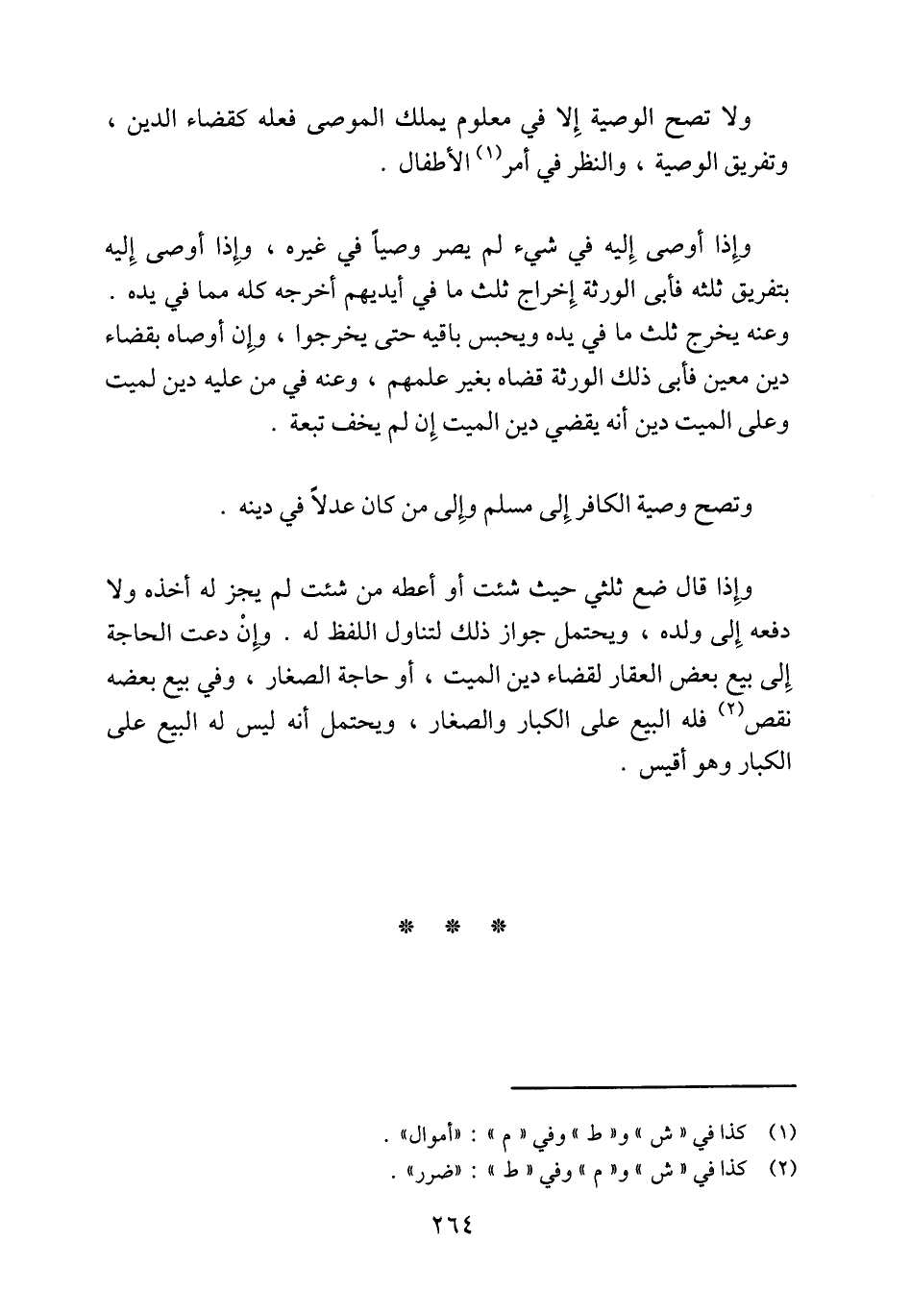 ولا تصح الوصية إِلا في معلوم يملك الموصى فعله كقضاء الدين، وتفريق الوصية، والنظر في أمر (¬1) الأطفال.