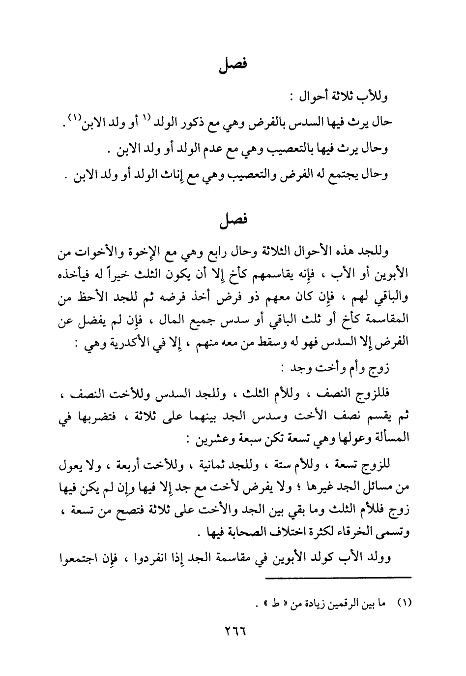 وللجد هذه الأحوال الثلاثة وحال رابع وهي مع الإِخوة والأخوات من الأبوين أو الأب، فإِنه يقاسمهم كأخ إِلا أن يكون الثلث خيراً له فيأخذه والباقي لهم، فإِن كان معهم ذو فرض أخذ فرضه ثم للجد الأحظ من المقاسمة كأخ أو ثلث الباقي أو سدس جميع المال، فإن لم يفضل عن الفرض إِلا السدس فهو له وسقط من معه منهم، إِلا في الأكدرية وهي: