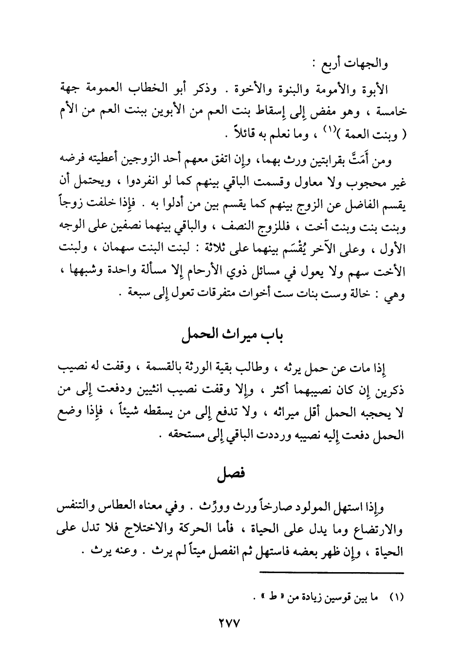 الأبوة والأمومة والبنوة والأخوة. وذكر أبو الخطاب العمومة جهة خامسة، وهو مفض إِلى إِسقاط بنت العم من الأبوين ببنت العم من الأم (وبنت العمة) (¬1)، وما نعلم به قائلاً.
