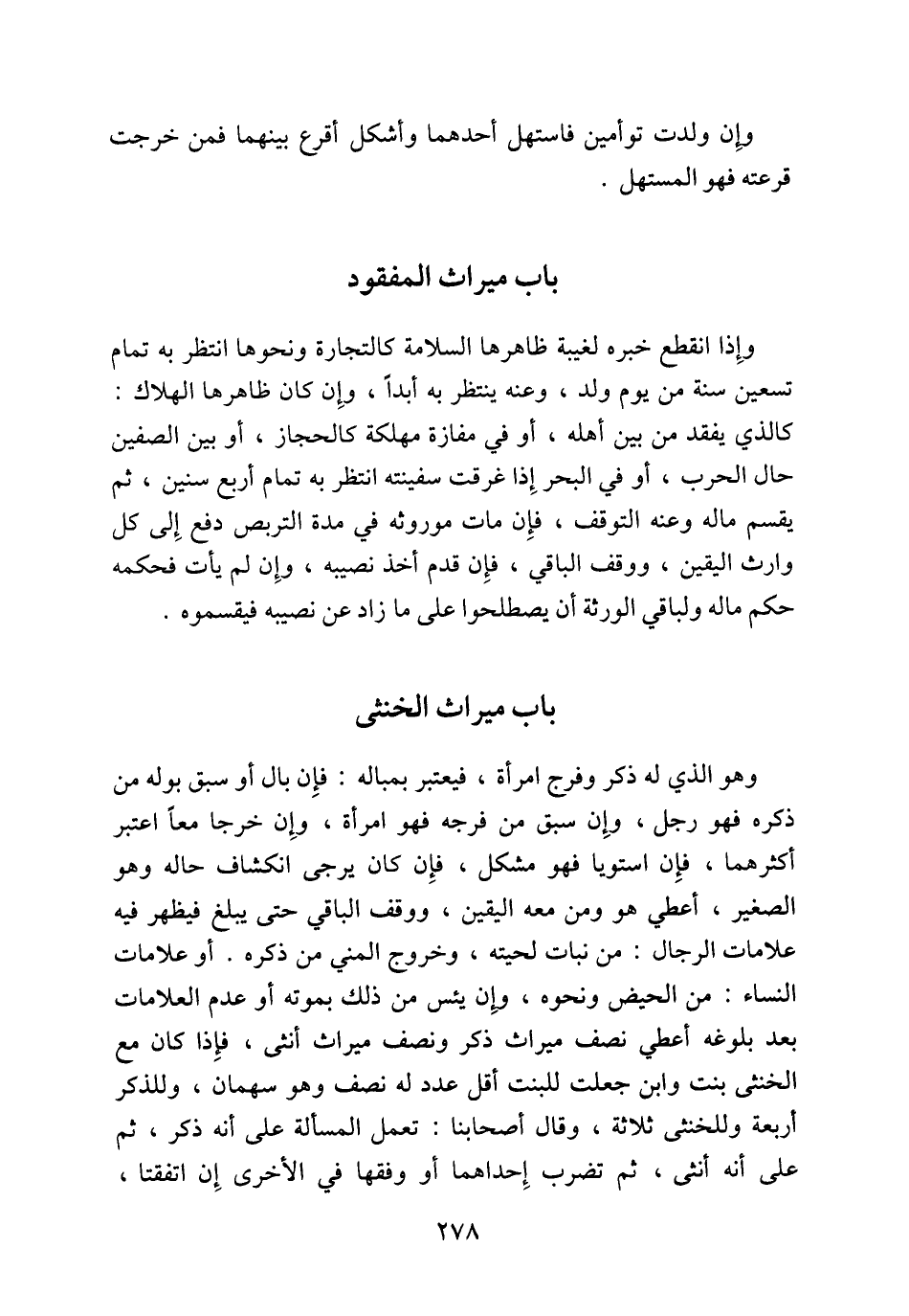 وهو الذي له ذكر وفرج امرأة، فيعتبر بمباله: فإِن بال أو سبق بوله من ذكره فهو رجل، وإِن سبق من فرجه فهو امرأة، وإِن خرجا معاً اعتبر أكثرهما، فإِن استويا فهو مشكل، فإِن كان يرجى انكشاف حاله وهو الصغير، أعطي هو ومن معه اليقين، ووقف الباقي حتى يبلغ فيظهر فيه علامات الرجال: من نبات لحيته، وخروج المني من ذكره. أو علامات النساء: من الحيض ونحوه، وإِن يئس من ذلك بموته أو عدم العلامات بعد بلوغه أعطي نصف ميراث ذكر ونصف ميراث أنثى، فإِذا كان مع الخنثى بنت وابن جعلت للبنت أقل عدد له نصف وهو سهمان، وللذكر أربعة وللخنثى ثلاثة، وقال أصحابنا: تعمل المسألة على أنه ذكر، ثم على أنه أنثى، ثم تضرب إِحداهما أو وفقها في الأخرى إِن اتفقتا،