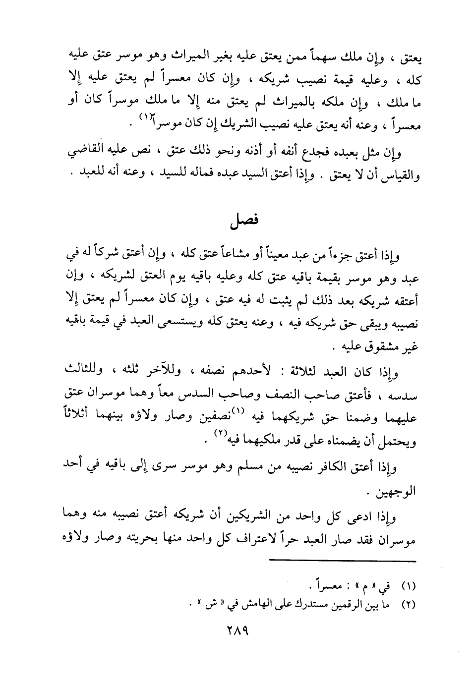 وإِذا كان العبد لثلاثة: لأحدهم نصفه، وللآخر ثلثه، وللثالث سدسه، فأعتق صاحب النصف وصاحب السدس معاً وهما موسران عتق عليهما وضمنا حق شريكهما فيه [نصفين وصار ولاؤه بينهما أثلاثاً ويحتمل أن يضمناه على قدر ملكيهما فيه (¬2)].