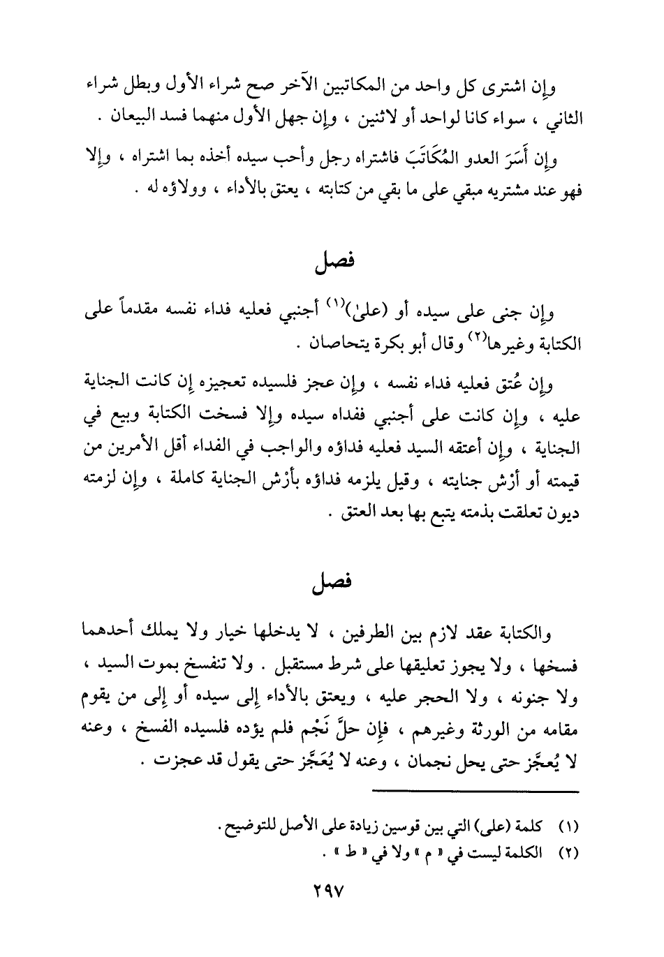 والكتابة عقد لازم بين الطرفين، لا يدخلها خيار ولا يملك أحدهما فسخها، ولا يجوز تعليقها على شرط مستقبل. ولا تنفسخ بموت السيد، ولا جنونه، ولا الحجر عليه، ويعتق بالأداء إِلى سيده أو إِلى من يقوم مقامه من الورثة وغيرهم، فإِن حلَّ نَجْم فلم يؤده فلسيده الفسخ، وعنه لا يُعجَّز حتى يحل نجمان، وعنه لا يُعَجَّز حتى يقول قد عجزت.