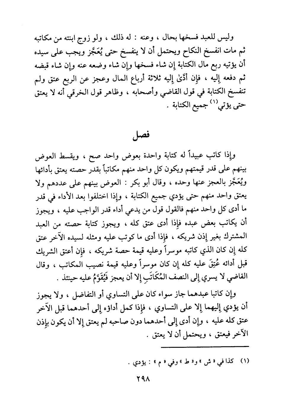 وليس للعبد فسخها بحال، وعنه: له ذلك، ولو زوج ابنته من مكاتبه ثم مات انفسخ النكاح ويحتمل أن لا ينفسخ حتى يُعَجَّز ويجب على سيده أن يؤتيه ربع مال الكتابة إِن شاء فسخها وإِن شاء وضعه عنه وإِن شاء قبضه ثم دفعه إِليه، فإِن أذَى إِليه ثلاثة أرباع المال وعجز عن الربع عتق ولم تنفسخ الكتابة في قول القاضي وأصحابه، وظاهر قول الخرقي أنه لا يعتق حتى يؤتي (¬1) جميع الكتابة.