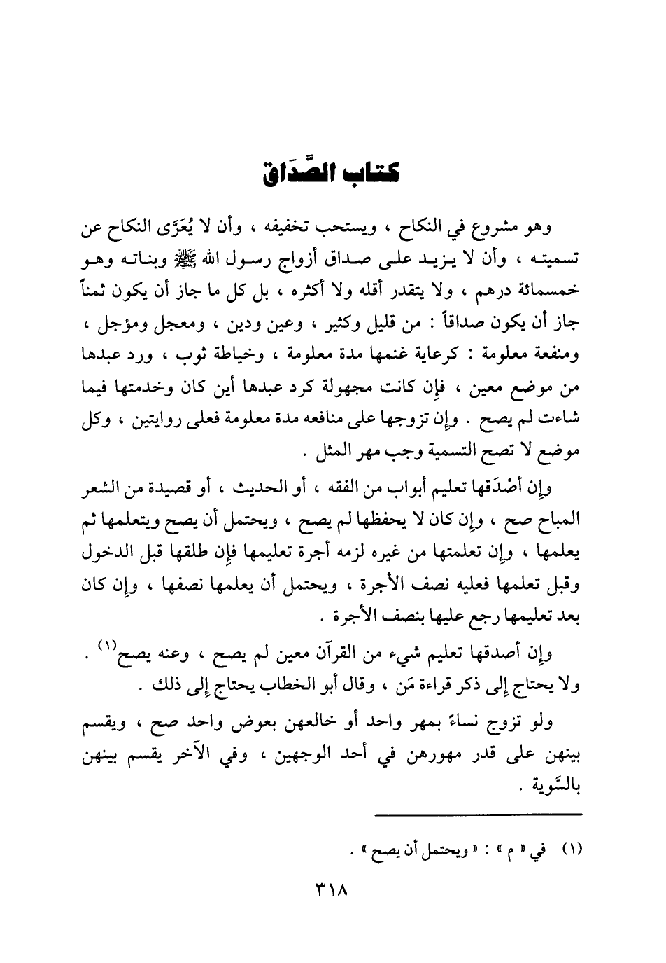 وهو مشروع في النكاح، ويستحب تخفيفه، وأن لا يُعَرَّى النكاح عن تسميته، وأن لا يزيد على صداق أزواج رسول الله - صلى الله عليه وسلم - وبناته وهو خمسمائة درهم، ولا يتقدر أقله ولا أكثره، بل كل ما جاز أن يكون ثمناً جاز أن يكون صداقاً: من قليل وكثير، وعين ودين، ومعجل ومؤجل، ومنفعة معلومة: كرعاية غنمها مدة معلومة، وخياطة ثوب، ورد عبدها من موضع معين، فإِن كانت مجهولة كرد عبدها أين كان وخدمتها فيما شاءت لم يصح. وإِن تزوجها على منافعه مدة معلومة فعلى روايتين، وكل موضع لا تصح التسمية وجب مهر المثل.