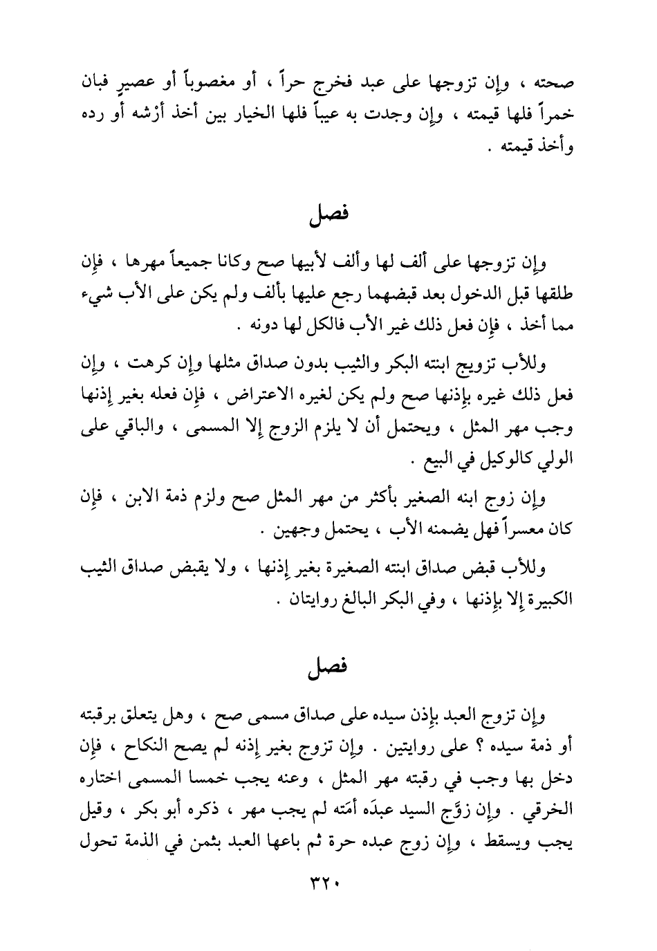وإِن تزوج العبد بإِذن سيده على صداق مسمى صح، وهل يتعلق برقبته أو ذمة سيده؟ على روايتين. وإِن تزوج بغير إِذنه لم يصح النكاح، فإِن دخل بها وجب في رقبته مهر المثل، وعنه يجب خمسا المسمى اختاره الخرقي. وإِن زوَّج السيد عبدَه أمَته لم يجب مهر، ذكره أبو بكر، وقيل يجب ويسقط، وإِن زوج عبده حرة ثم باعها العبد بثمن في الذمة تحول