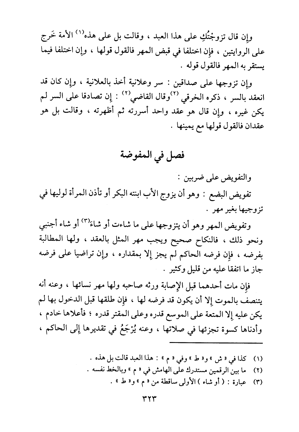 وتفويض المهر وهو أن يتزوجها على ما شاءت أو شاءَ (¬3) أو شاء أجنبي ونحو ذلك، فالنكاح صحيح ويجب مهر المثل بالعقد، ولها المطالبة بفرضه، فإِن فرضه الحاكم لم يجز إِلا بمقداره، وإِن تراضيا على فرضه جاز ما اتفقا عليه من قليل وكثير.