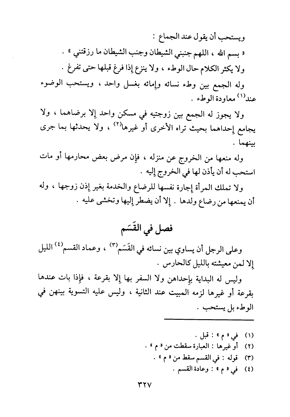 وعلى الرجل أن يساوي بين نسائه في القَسَم (¬3)، وعماد القسم (¬4) الليل إِلا لمن معيشته بالليل كالحارس.