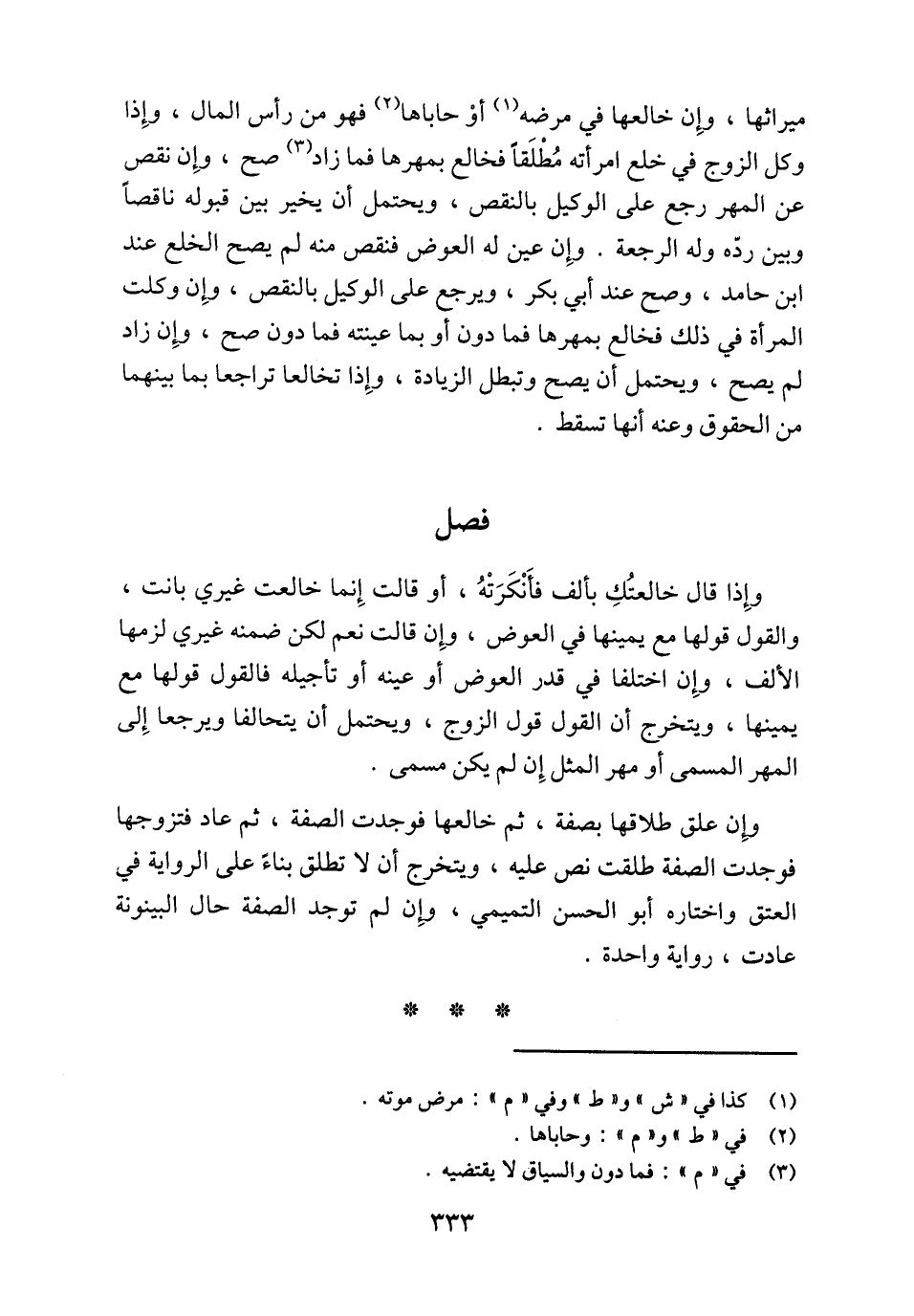 ميراثها، وإِن خالعها في مرضه (¬1) أوْ حاباها (¬2) فهو من رأس المال، وإِذا وكل الزوج في خلع امرأته مُطْلَقاً فخالع بمهرها فما زاد (¬3) صح، وإِن نقص عن المهر رجع على الوكيل بالنقص، ويحتمل أن يخير بين قبوله ناقصاً وبين ردّه وله الرجعة. وإِن عين له العوض فنقص منه لم يصح الخلع عند ابن حامد، وصح عند أبي بكر، ويرجع على الوكيل بالنقص، وإِن وكلت المرأة في ذلك فخالع بمهرها فما دون أو بما عينته فما دون صح، وإِن زاد لم يصح، ويحتمل أن يصح وتبطل الزيادة، وإِذا تخالعا تراجعا بما بينهما من الحقوق وعنه أنها تسقط.