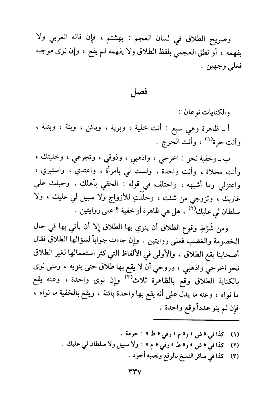 ب - وخفية نحو: اخرجي، واذهبي، وذوقي، وتجرعي، وخليتك، وأنت مخلاة، وأنت واحدة، ولست لي بامرأة، واعتدي، واستبري، واعتزلي وما أشبهه، واختلف في قوله: الحقي بأهلك، وحبلك على غاربك، وتزوجي من شئت، وحلَلْتِ للأزواج ولا سبيل لي عليك، ولا سلطان لي عليك (¬2)، هل هي ظاهرة أو خفية؟ على روايتين.