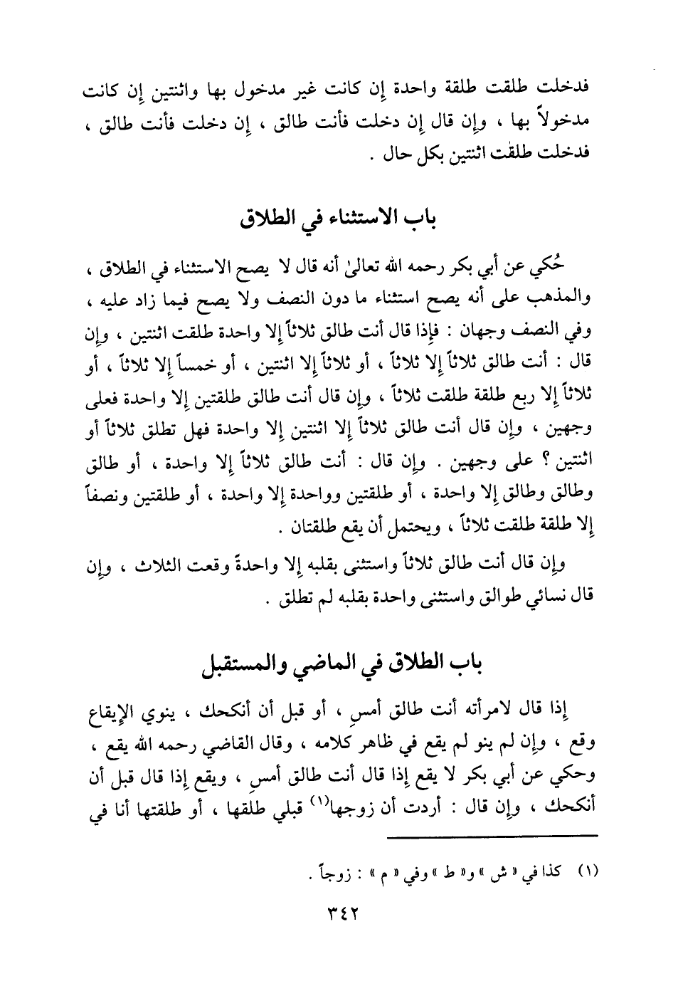 حُكي عن أبي بكر رحمه الله تعالى أنه قال لا يصح الاستثناء في الطلاق، والمذهب على أنه يصح استثناء ما دون النصف ولا يصح فيما زاد عليه، وفي النصف وجهان: فإِذا قال أنت طالق ثلاثاً إِلا واحدة طلقت اثنتين، وإِن قال: أنت طالق ثلاثاً إِلا ثلاثاً، أو ثلاثاً إِلا اثنتين، أو خمساً إِلا ثلاثاً، أو ثلاثاً إِلا ربع طلقة طلقت ثلاثاً، وإِن قال أنت طالق طلقتين إِلا واحدة فعلى وجهين، وإِن قال أنت طالق ثلاثاً إِلا اثنتين إِلا واحدة فهل تطلق ثلاثاً أو اثنتين؟ على وجهين. وإِن قال: أنت طالق ثلاثاً إِلا واحدة، أو طالق وطالق وطالق إِلا واحدة، أو طلقتين وواحدة إِلا واحدة، أو طلقتين ونصفاً إِلا طلقة طلقت ثلاثاً، ويحتمل أن يقع طلقتان.