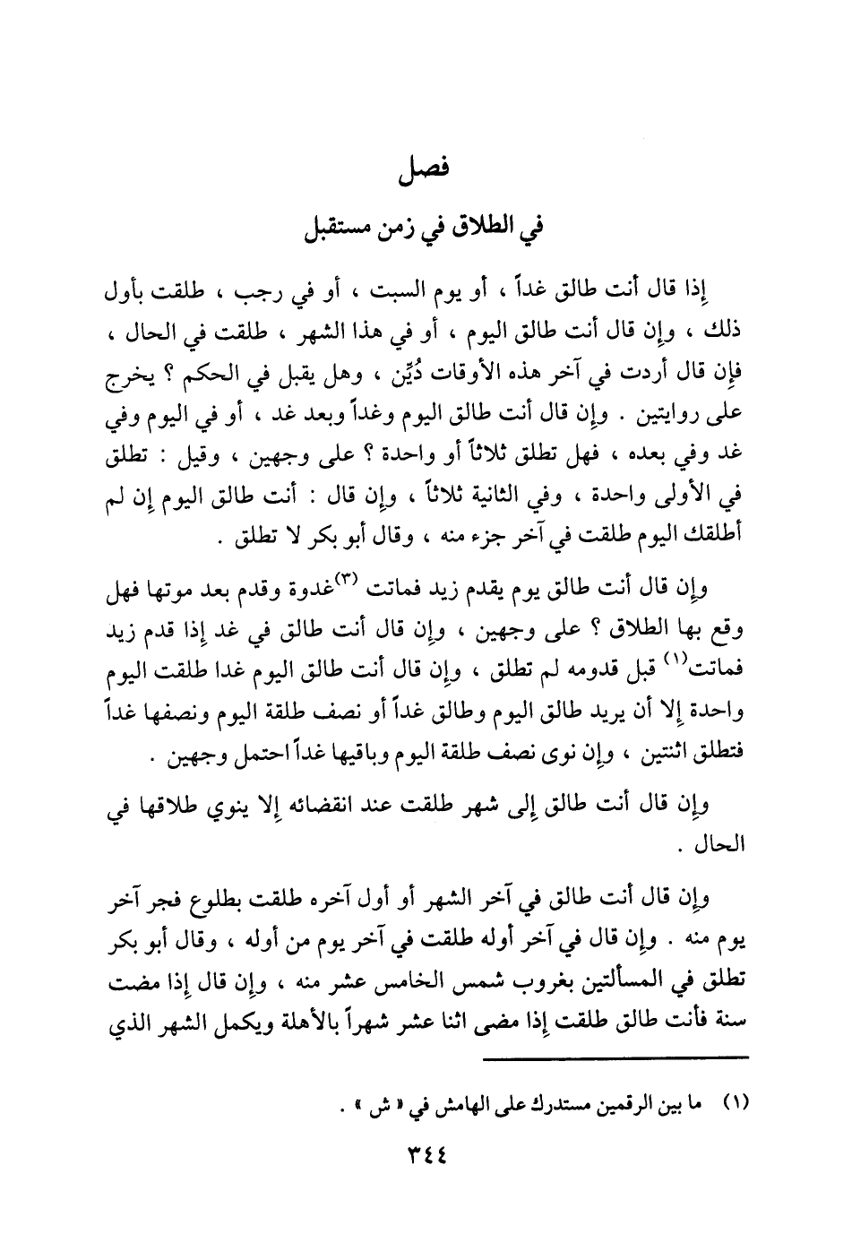 وإِن قال أنت طالق إِلى شهر طلقت عند انقضائه إِلا ينوي طلاقها في الحال. وإِن قال أنت طالق في آخر الشهر أو أول آخره طلقت بطلوع فجر آخر يوم منه. وإِن قال في آخر أوله طلقت في آخر يوم من أوله، وقال أبو بكر تطلق في المسألتين بغروب شمس الخامس عشر منه، وإِن قال إِذا مضت سنة فأنت طالق طلقت إِذا مضى اثنا عشر شهراً بالأهلة ويكمل الشهر الذي
