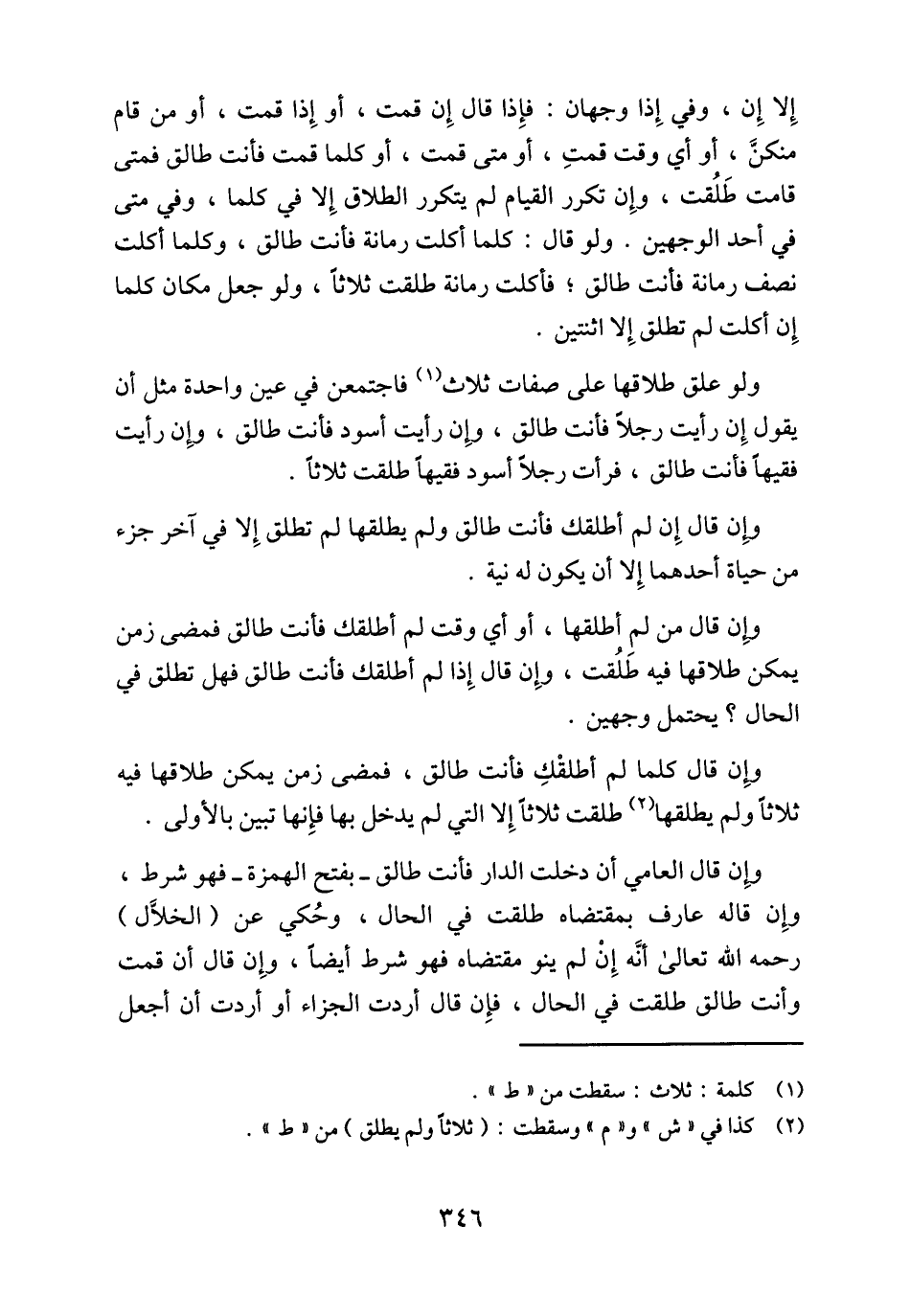 إِلا إِن، وفي إِذا وجهان: فإِذا قال إِن قمت، أو إِذا قمت، أو من قام منكنَّ، أو أي وقت قمتِ، أو متى قمت، أو كلما قمت فأنت طالق فمتى قامت طَلُقت، وإِن تكرر القيام لم يتكرر الطلاق إِلا في كلما، وفي متى في أحد الوجهين. ولو قال: كلما أكلت رمانة فأنت طالق، وكلما أكلت نصف رمانة فأنت طالق؛ فأكلت رمانة طلقت ثلاثاً، ولو جعل مكان كلما إِن أكلت لم تطلق إِلا اثنتين.