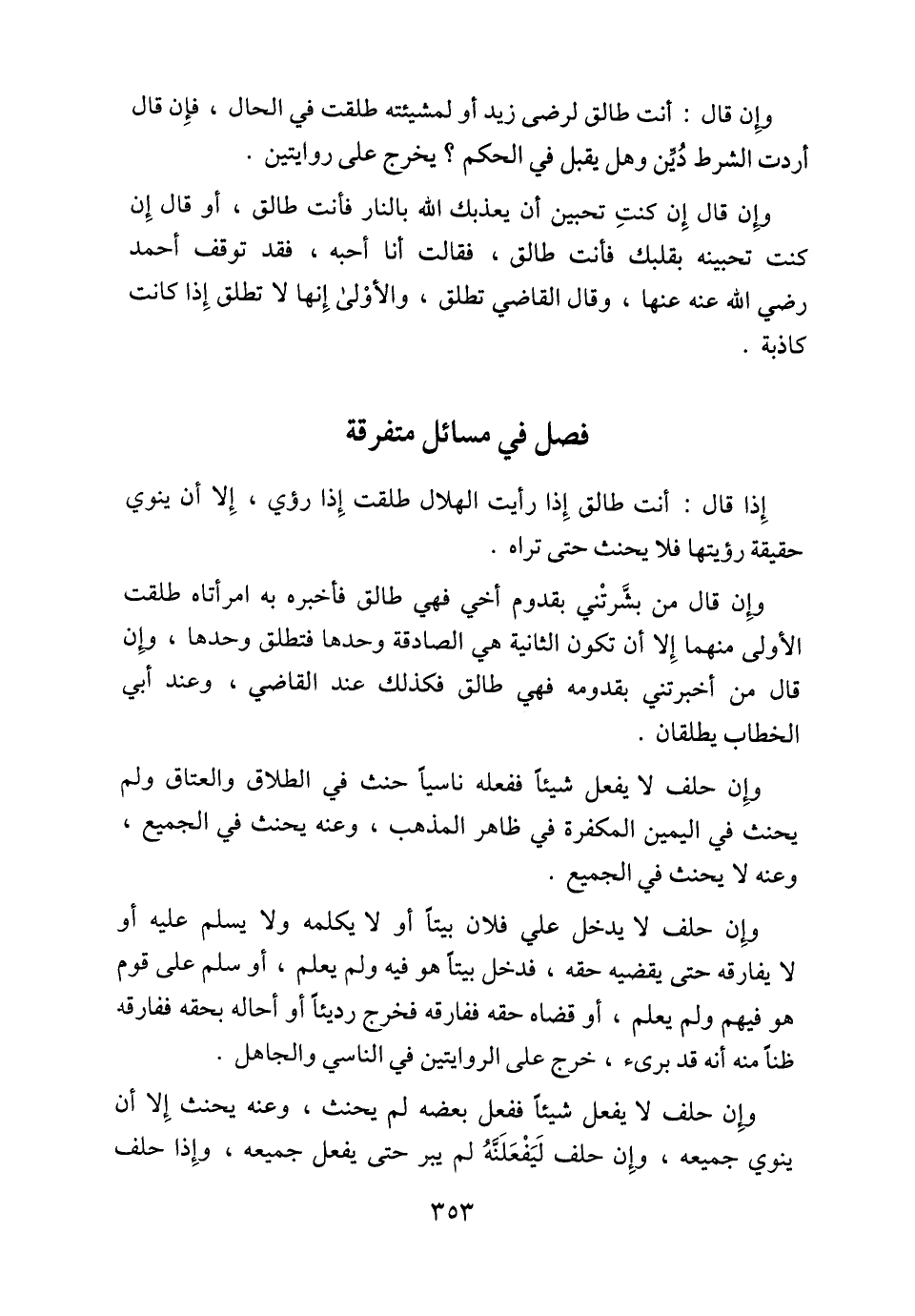 وِإن قال إِن كنتِ تحبين أن يعذبك الله بالنار فأنت طالق، أو قال إِن كنت تحبينه بقلبك فأنت طالق، فقالت أنا أحبه، فقد توقف أحمد رضي الله عنه عنها، وقال القاضي تطلق، والأوْلى إِنها لا تطلق إِذا كانت كاذبة.