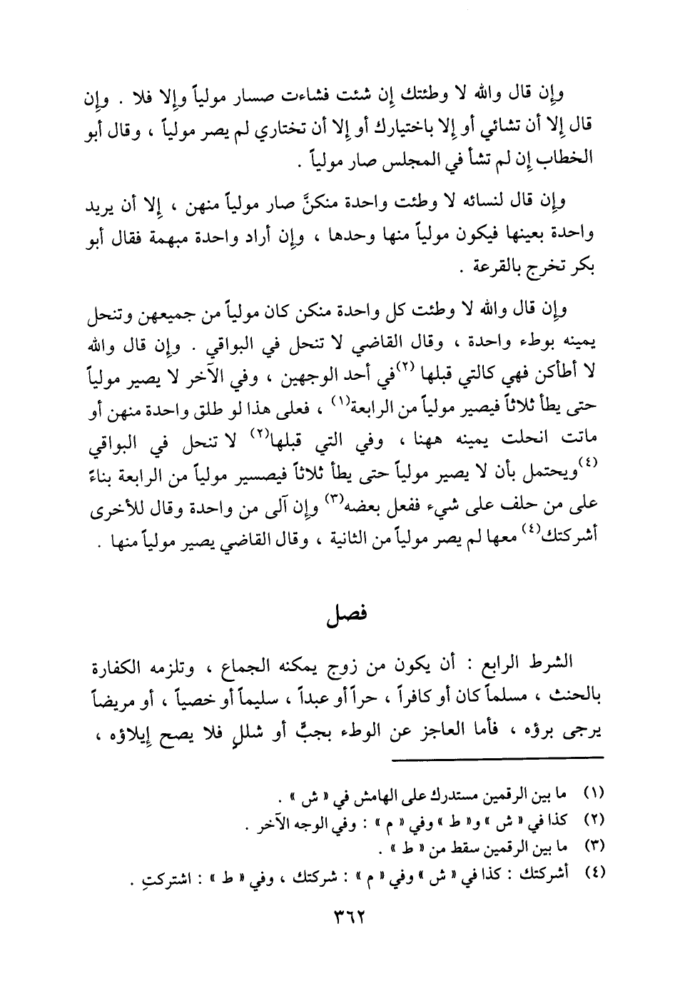 وإِن قال والله لا وطئت كل واحدة منكن كان مولياً من جميعهن وتنحل يمينه بوطء واحدة، وقال القاضي لا تنحل في البواقي. وإِن قال والله لا أطأكن فهي كالتي قبلها (2) في أحد الوجهين، وفي الآخر لا يصير مولياً حتى يطأ ثلاثاً فيصير مولياً من الرابعة (¬1)، فعلى هذا لو طلق واحدة منهن أو ماتت انحلت يمينه ههنا، وفي التي قبلها (¬2) لا تنحل في البواقي (4) ويحتمل بأن لا يصير مولياً حتى يطأ ثلاثاً فيصير مولياً من الرابعة بناءً على من حلف على شيء ففعل بعضه (¬3) وإِن آلى من واحدة وقال للأخرى أشركتك (¬4) معها لم يصر مولياً من الثانية، وقال القاضي يصير مولياً منها.