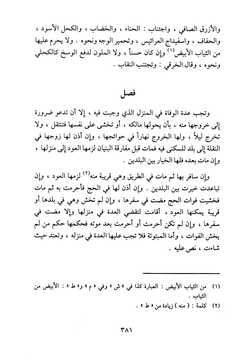 وتجب عدة الوفاة في المنزل الذي وجبت فيه، إِلا أن تدعو ضرورة إِلى خروجها منه، بأن يحولها مالكه، أو تخشى على نفسها فتنتقل، ولا تخرج ليلًا، ولها الخروج نهاراً في حوائجها، وإِن أذن لها زوجها في النقلة إِلى بلد للسكنى فيه فمات قبل مفارقة البنيان لزمها العود إِلى منزلها، وإِن مات بعده فلها الخيار بين البلدين.